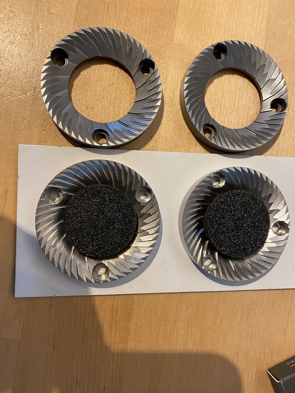 Ik ben blij dat ik dit topic heb gevonden! Ik heb sinds maart een Specialita en hoewel ik tevreden over was, viel het mij ook op dat de maaltijd vrij lang was vergeleken met wat je ziet op Youtube en leest op internet. Ik maalde zo'n 18.5 seconden voor 18gram koffie in -> 36-40gr espresso uit met mijn Botticelli II. Mijn serienummer zat inderdaad ook in de range van eerder dit jaar die mogelijk niet goed zou zijn (PH0012). Inmiddels heb ik de maalschijven vervangen, vervangende set heeft de inscriptie 'Eureka' en 'HS' op de achterkant van de maalschijf, de oude alleen 'Eureka' op de zijkant (zie foto, nieuwe schijven op het karton). De maaltijd is inmiddels teruggebracht naar 11 seconden. Meteen nieuwe bonen geprobeerd (Tanzania vd Brandzaak) en hoef 'm een stuk minder fijn te draaien, nu 3,5 waar ik eerder altijd tussen 1,5 en 2 zat. Zal misschien deels aan de bonen liggen maar dat het andere maalschijven zijn is overduidelijk! Dank allen voor jullie input!