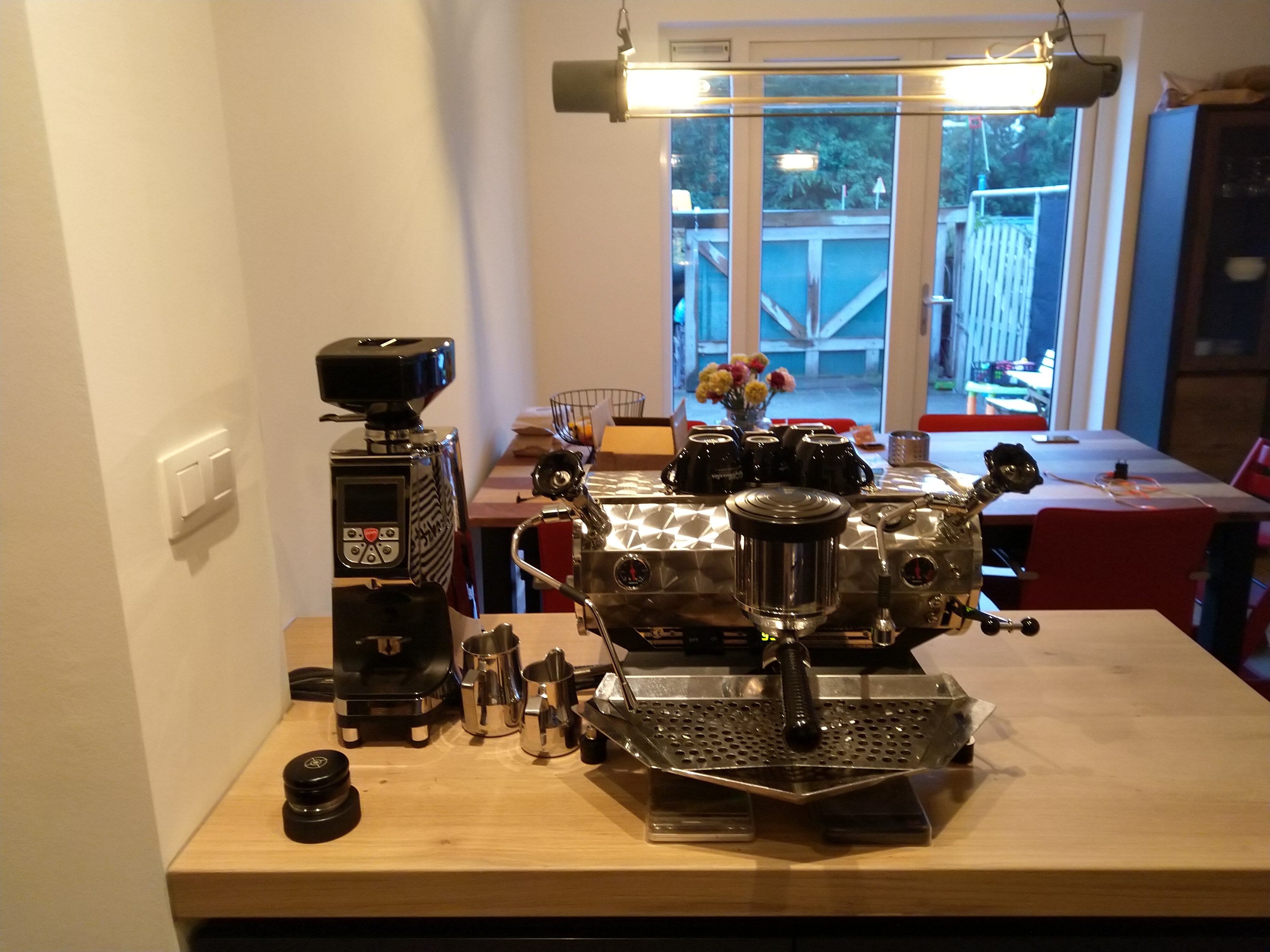 66Waanzinnig! Toen Liander was geweest voor de aansluiting (lang verhaal...renovatie) als allereerste de espressogroep aangezet en de Speedster opgewarmd. Daarna is hij eigenlijk niet meer uit geweest. Het was wel weer even wennen én een nieuwe molen én een POMP machine. Nogsteeds netjes aan het wegen en was een beetje zoeken met temperatuur maar oe-la-la wat wordt de moeite beloond!