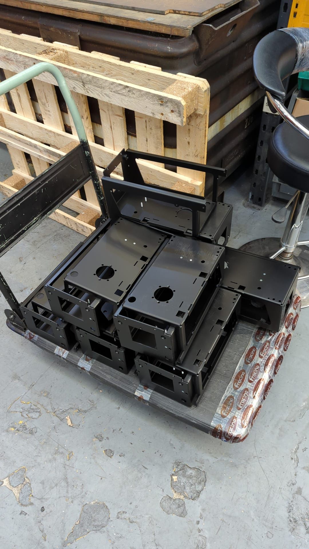 Een aantal Vectis frames van de serie die terug is van poedercoating, andere onderdelen worden ook klaargezet in voorbereiding op de eerste productie-run:
