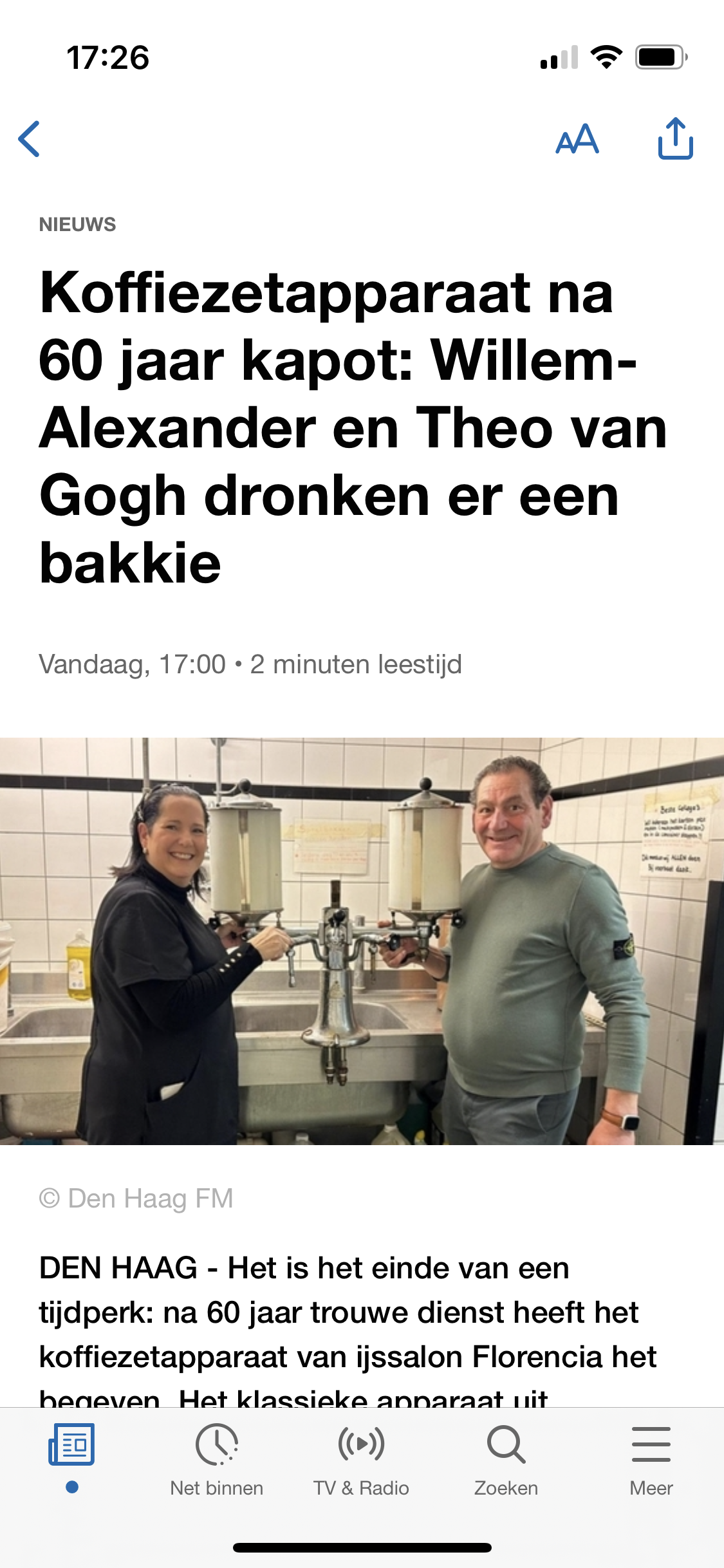 Ik woonde destijds de jaren 70 in Den Haag ,een vriend van mij was wederverkoper van het ijs van Florencia tot het moment dat de eigenaar met zijn stropdas in de ijsmachine kwam en stikte, mijn zwager uit Apeldoorn dacht dat die een ijsje van 2 gulden wel op kon dus die bestelde dat, kreeg die een grote karton emmer van 2 liter met ijs, daar betaalde je destijds in Apeldoorn zeker 5 gulden voor super goedkoop ijs verkochten ze toen@3aan schreef: za 08 okt 2022, 00:50 Het Florencia machien werkte met een koffie concentraat wat op een matige temperatuur werd gehouden daar werd een kleine hoeveelheid van in een kopje getapt en daar ging een soort van melkschuim bovenop, ik denk dat het melk met een smaakje was en iets aangezoet, ze maakten natuurlijk ook grote hoeveelheden ijs en konden zodoende wel met smaak stoeien, heb er vaak een bakkie gedaan en er zeer betaalbare smakelijke broodjes gegeten.