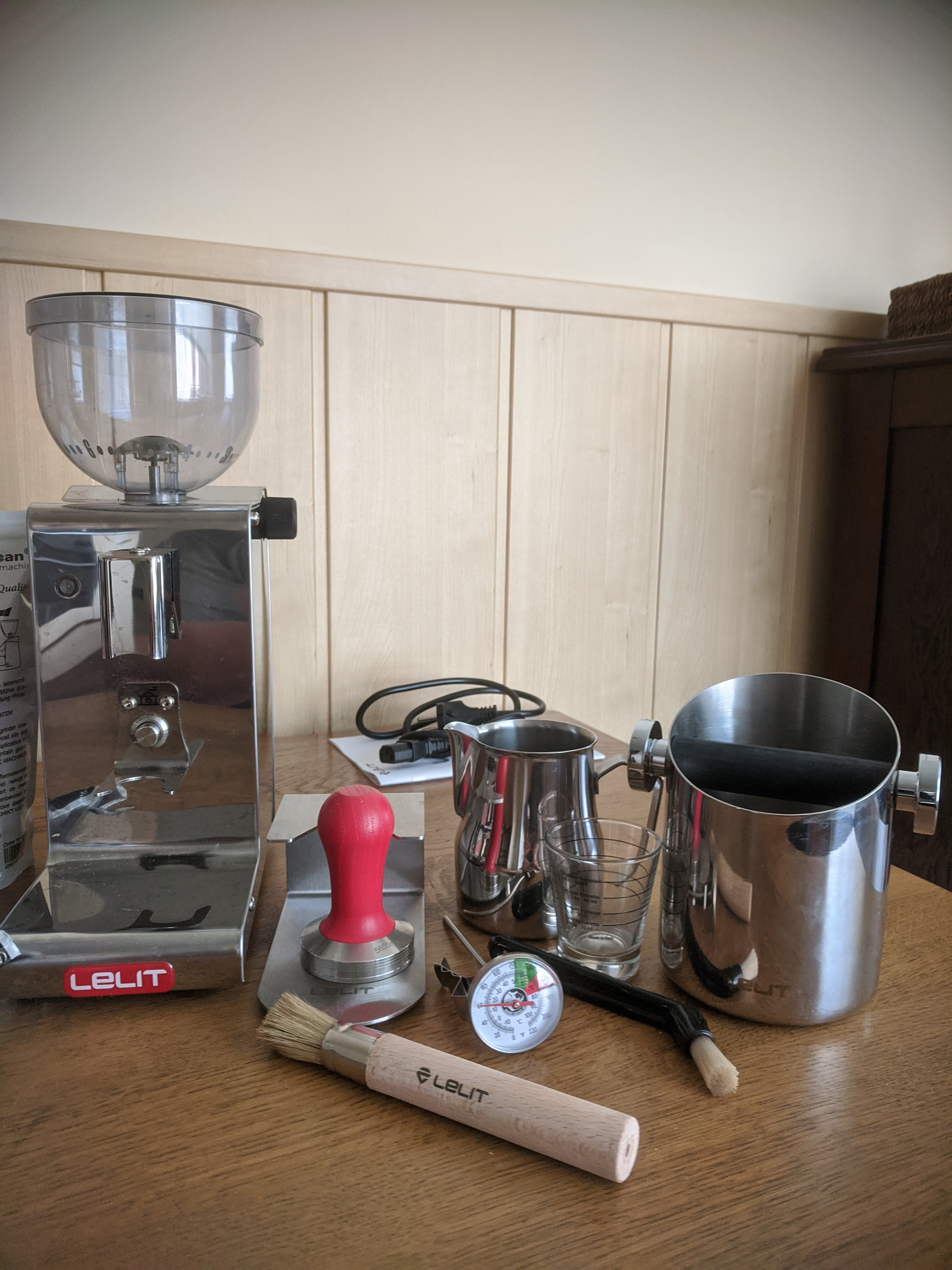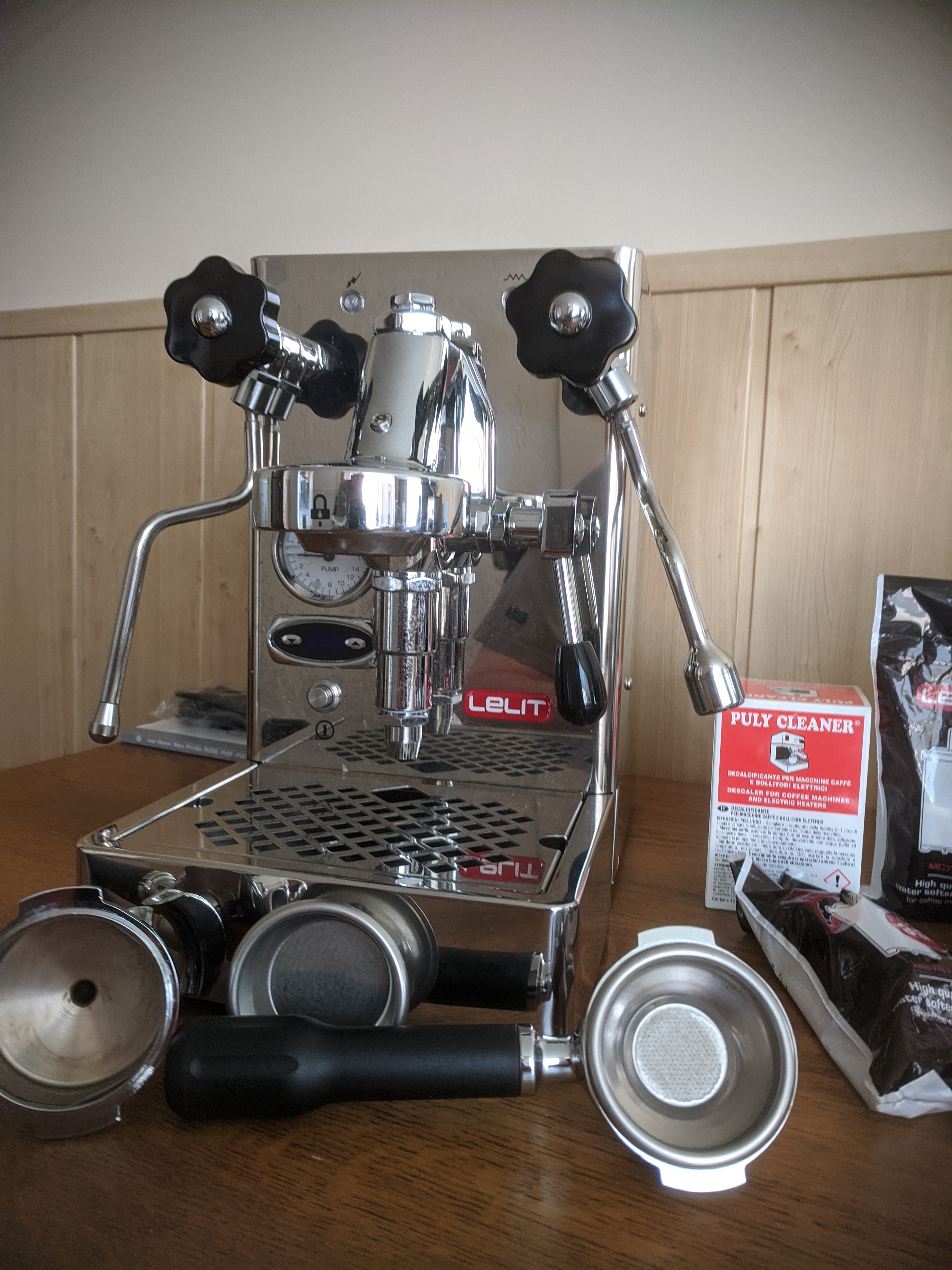plus alle toebehoren: tamperstation (lelit), afklopbak (lelit), 3 waterfilters (lelit), melkkan, borsteltjes, shotglas, vloeistofthermometer en reinigingsartikelen.