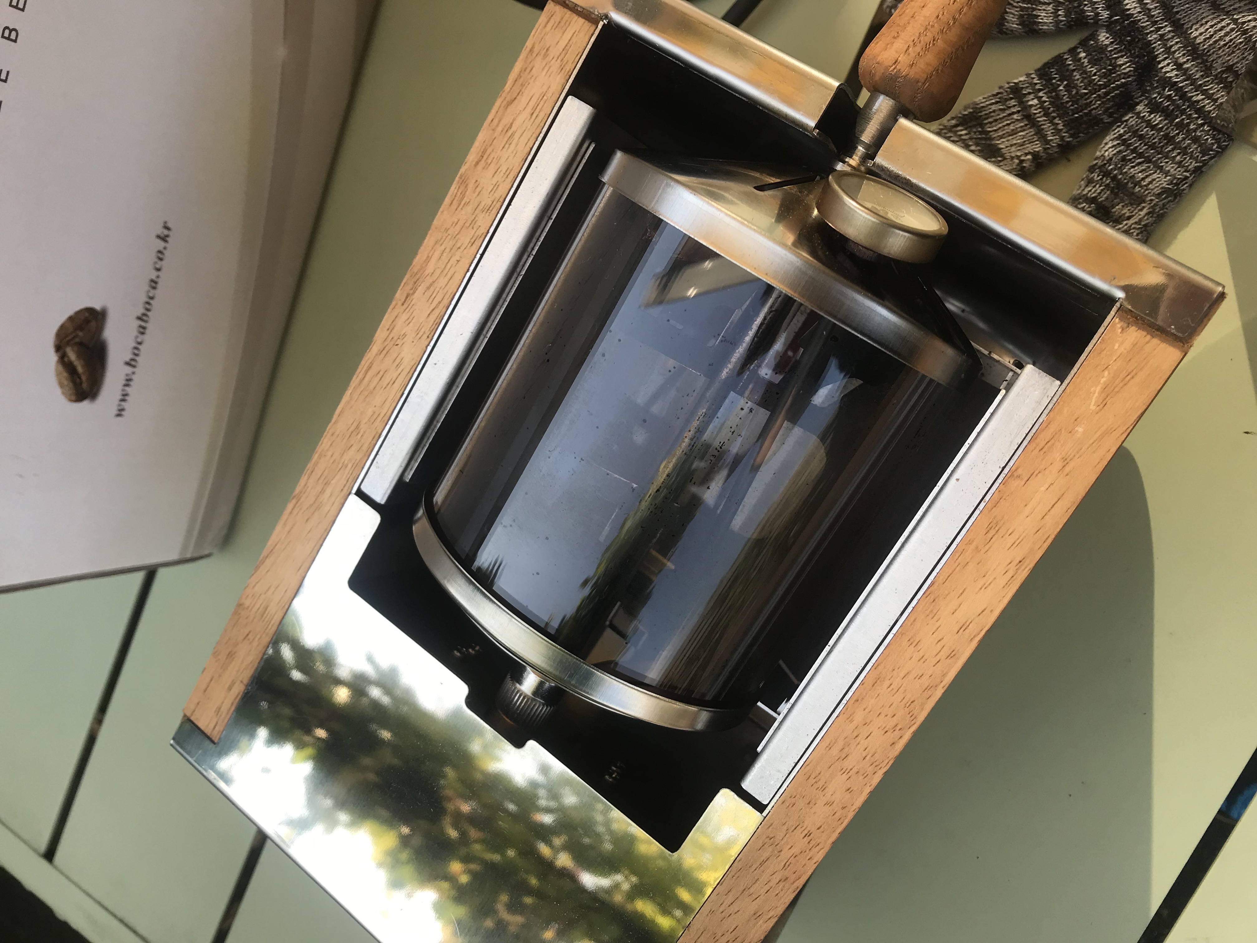 Ik heb de Boca flink gebruikt en in het jaar dat ik hem heb heb ik 185 batches van 200 gram gebrand. In de loop van het jaar heeft het klepje het begeven en heb ik een ander sluiting van de drum gefabriceerd. Daarbij is het nu wel van belang dat je een hittewerende handschoen gebruikt (die doe ik vanzelfsprekend bij). Batchsize van maximaal 200 gram en de verhitting gebeurt door middel van een infraroodlampje. Het vrij intensieve gebruik is natuurlijk wel te zien, maar hij functioneert nog prima. (Indien gewenst kun je op eBay een nieuwe drum) bestellen.
