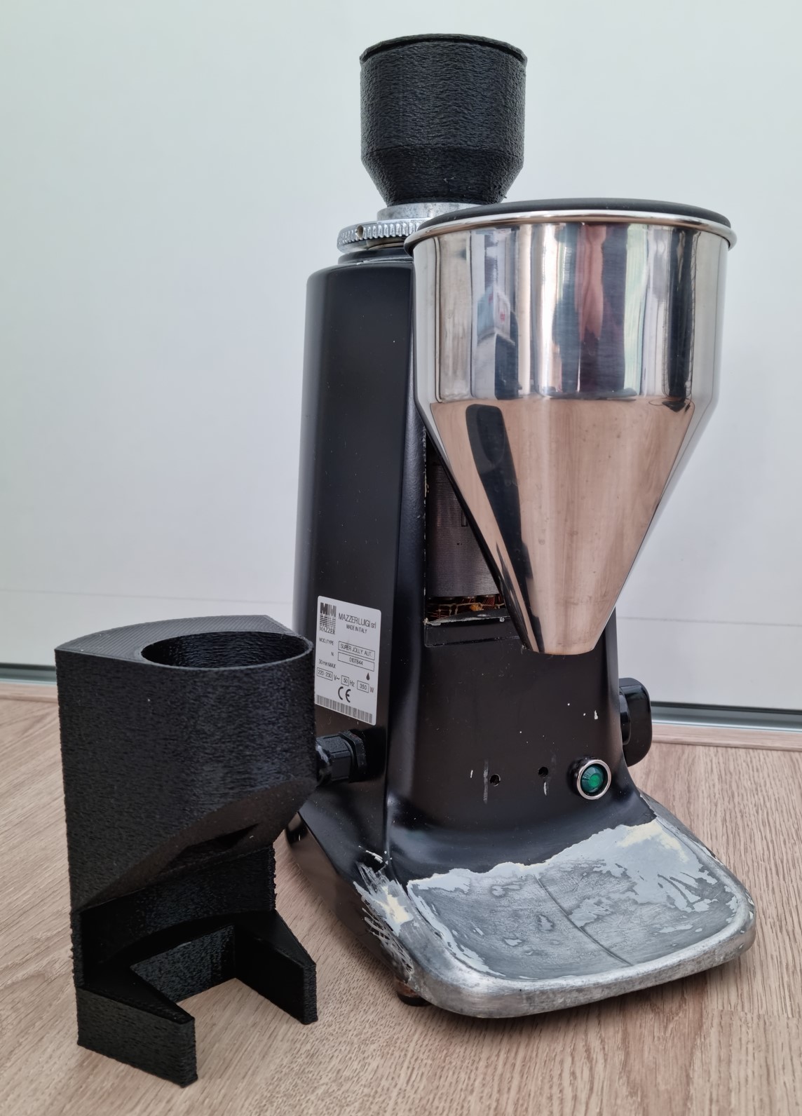 De hopper is vervangen voor een 3D geprinte single dose hopper. En de onhandige doser vervangen voor die van een Mazzer Mini. Daarnaast nog een 3D geprinte doser meegeleverd.