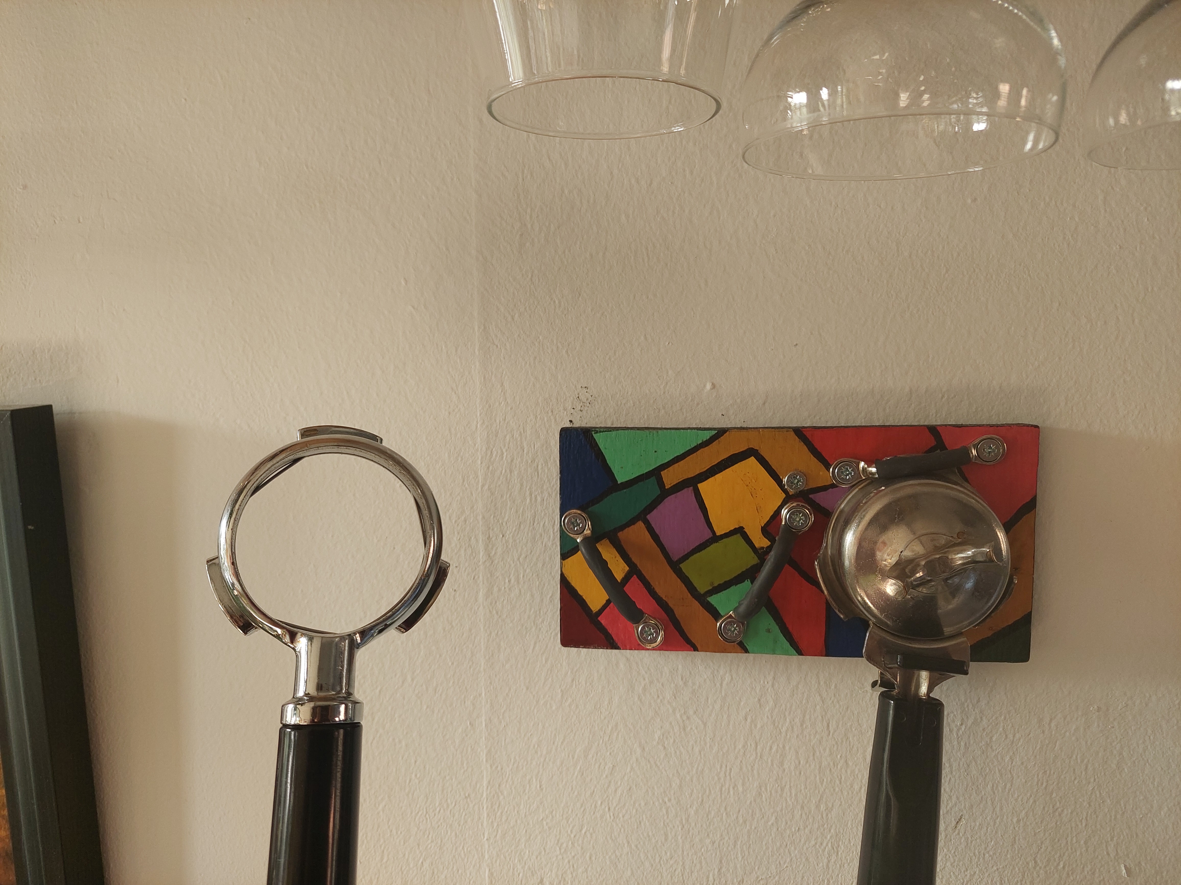 Gebruik een Motta trechter om direct in het filterbakje te dosen. Vervolgens een DIY WDT tool (accupunctuurnaalden door een stukje kurk) en platte tamper.