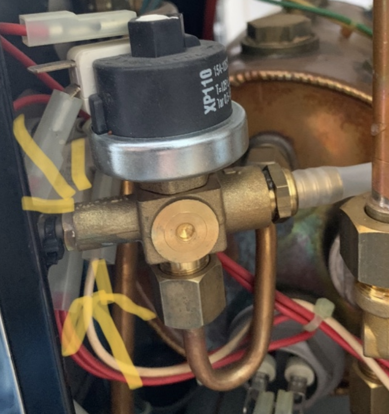 5Denk niet dat het aan de pressostaat/OPV ligt. Waar loopt het slangetje aan de andere kant van het Y-stuk naartoe? Naar de vacuum breaker bovenop de de boiler denk ik?