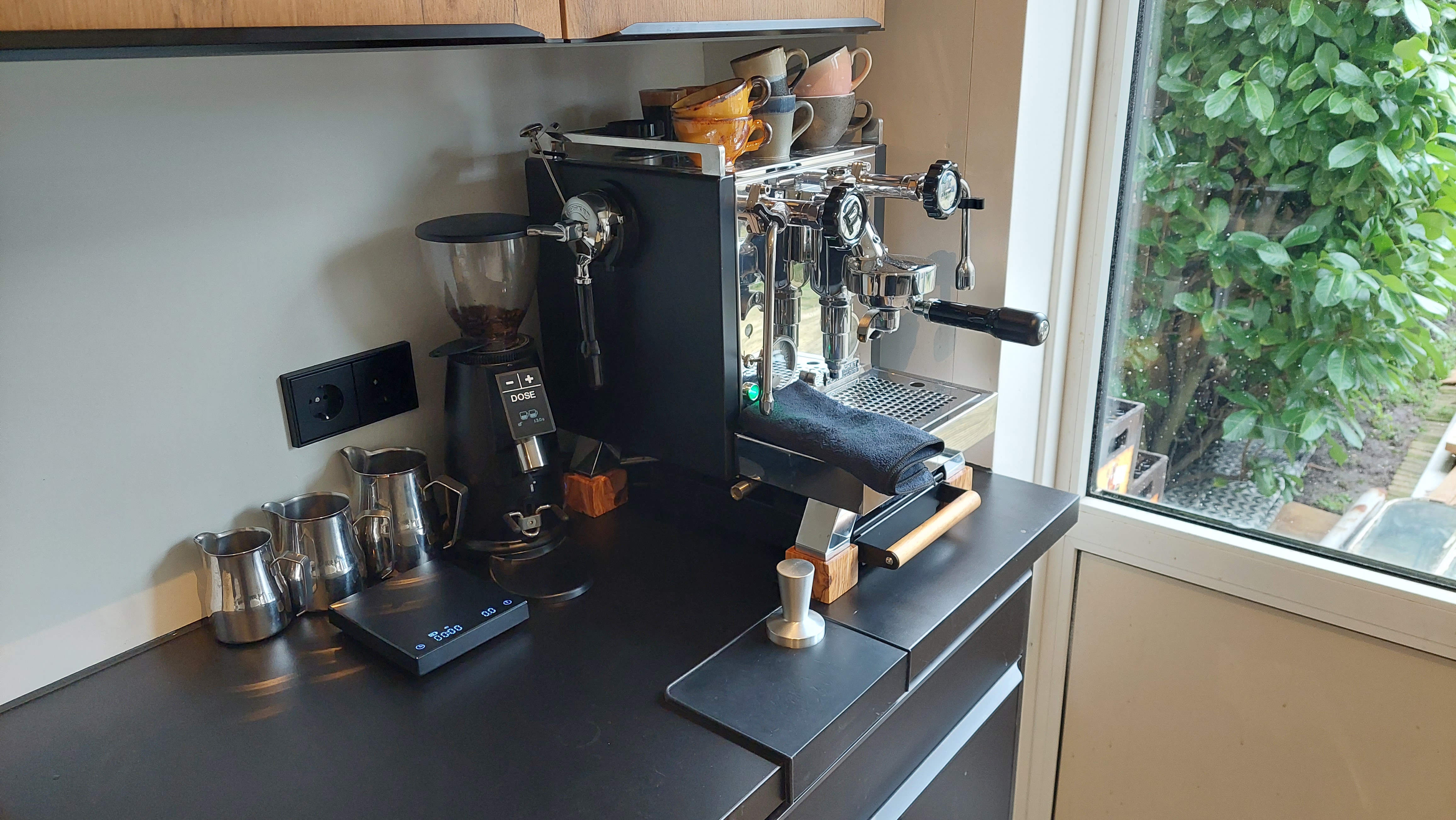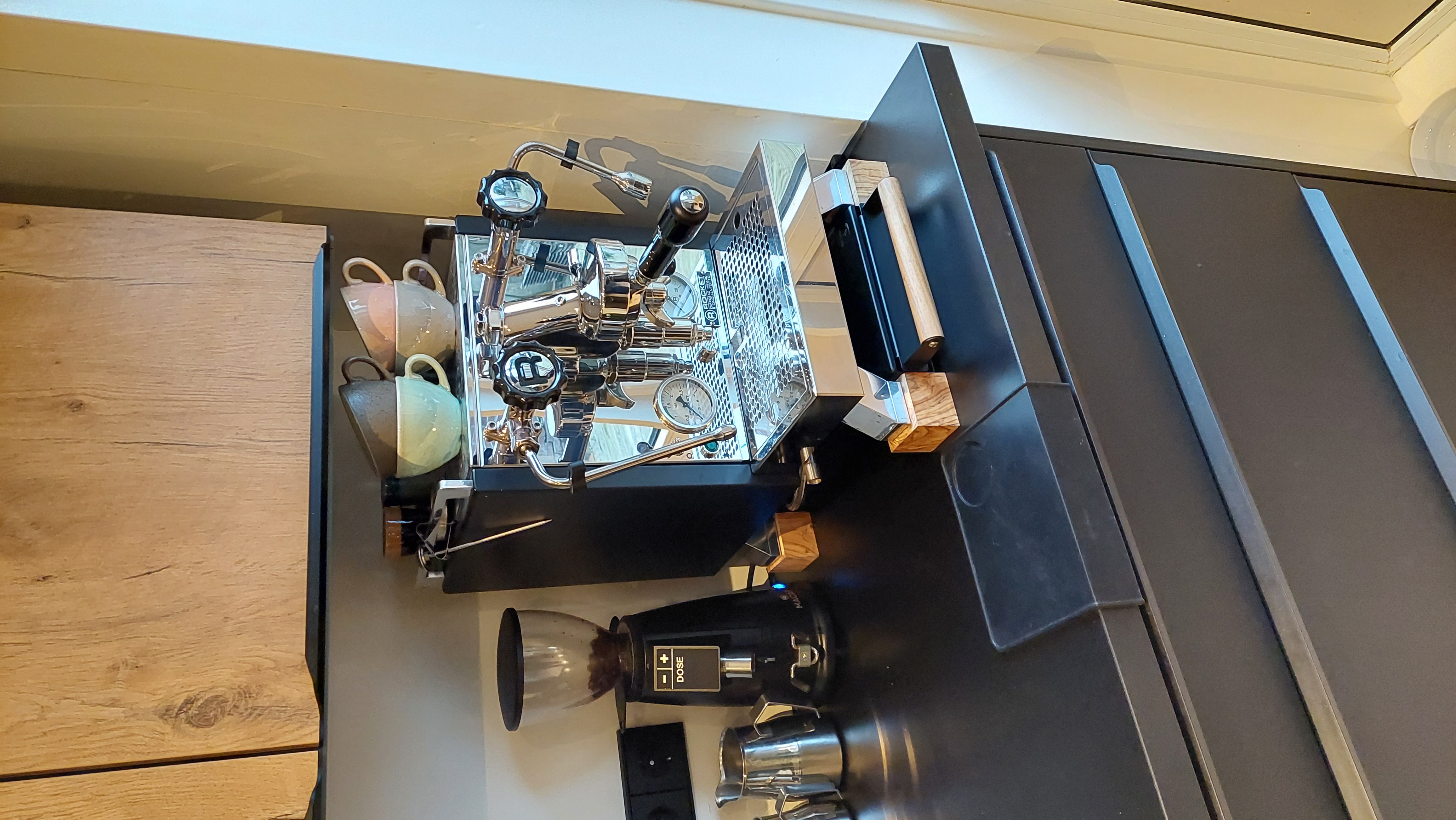 Na een tijdje sparen en onderzoeken had ik bijna een VBM domobar Super gekocht. Echter was die nergens meer op voorraad. Er was wel een nieuwe versie, maar die had een niet zo klassiek ogende futuristische uitstraling. Toen ben ik wat door gaan zoeken (en sparen) en heb ik uiteindelijk een Rocket R58 gekocht, vergezeld door een Macap M2E Domus. Ik heb de zijpanelen van de Rocket zwart gewrapped (Natuurlijk moet het er op het aanrecht ook goed uitzien).