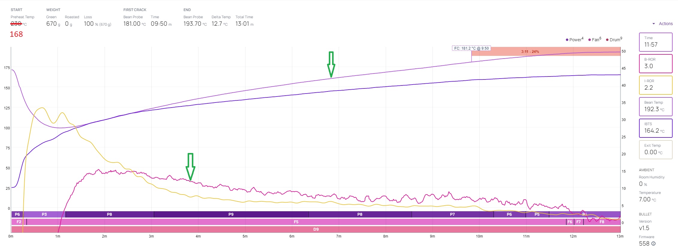 IBTS is lang niet schoongemaakt, te zien aan de al vroeg kruisende profiel lijnen. Daardoor is de IBTS nu geen betrouwbare indicator zoals je zelf aangeeft. Preheat op de probe is echter ook niet betrouwbaar omdat die niet de temperatuur van de drum aangeeft, maar de temperatuur van de lucht in de trommel en die is nogal variabel, afhankelijk van o.a. de omgevingstemperatuur.