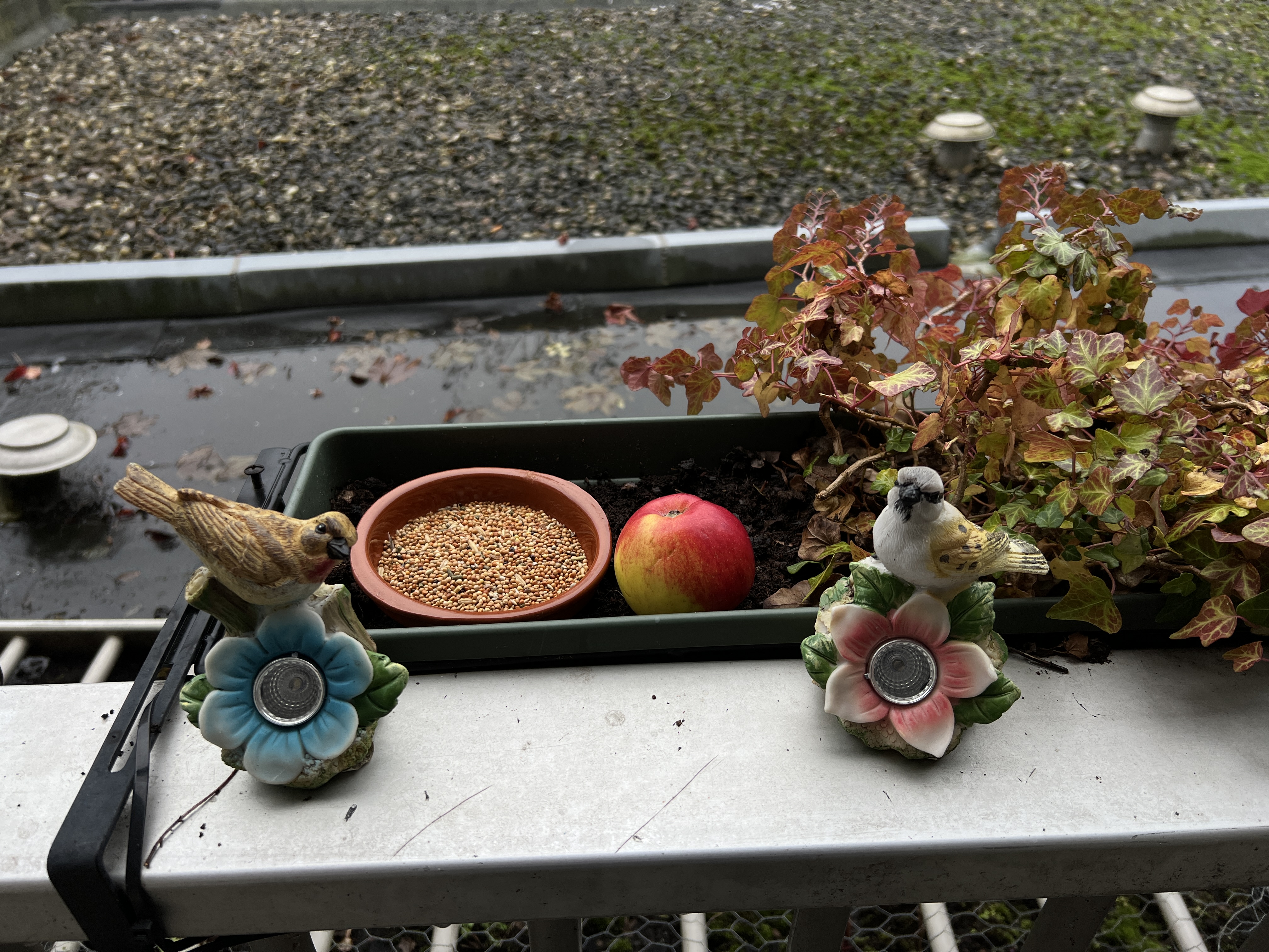Op balkon een voederplekje gemaakt, stenen vogeltjes erbij om duidelijk te maken aan de dieren voor wie het is bedoeld.