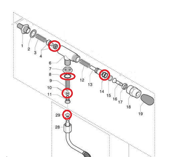 8Vooral dat 4-kante busje van het ventiel (nr 4) eraf draaien moet je heel voorzichtig doen. Dat breekt zo af. Maar je moet het losdraaien, anders kan je het rubbertje niet vervangen.