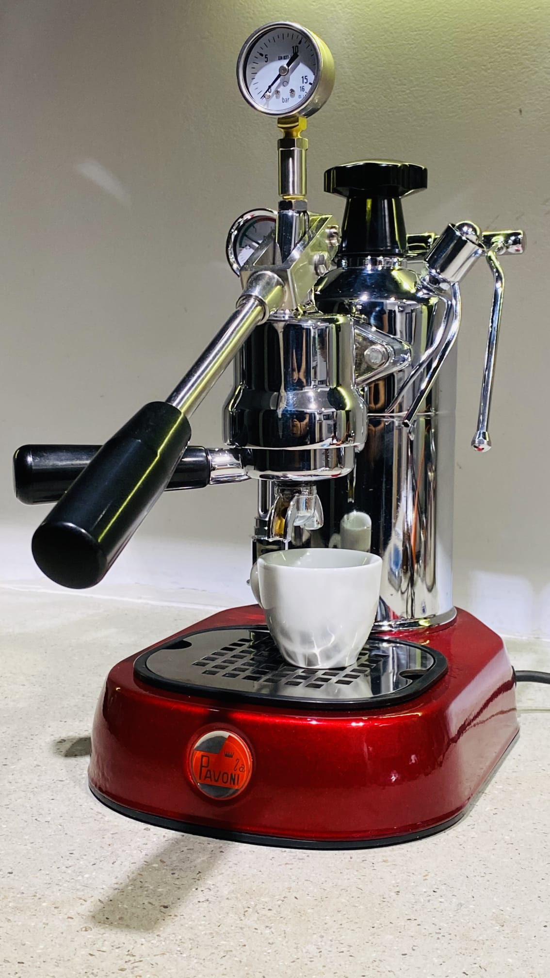Enkele jaren geleden werd deze Pavoni helemaal geüpgrade door Tudor van Coffee Sensor. Zo staat er nu onder andere een tweede manometer op waarmee je, naast de boilerdruk, ook de zetdruk kan aflezen. Ook zit er de 'Bong' isolator op: deze staat toe dat de boilerdruk hoger kan worden ingesteld (lees: betere druk voor het stomen), zonder dat de zetgroep te heet wordt.