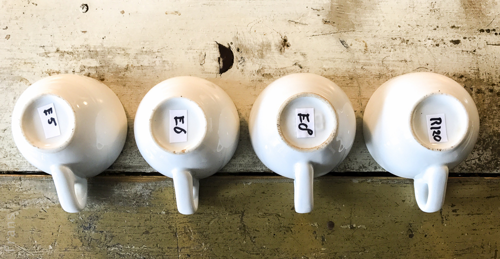 Vandaag kwam Tije proeven. Ik heb tweemaal vier espresso's voor hem gemaakt, een van elke maler. Hij proefde en plaatste de kopjes in volgorde van zijn voorkeur, waarna we onderop de kopjes keken van welke maler die kwam.