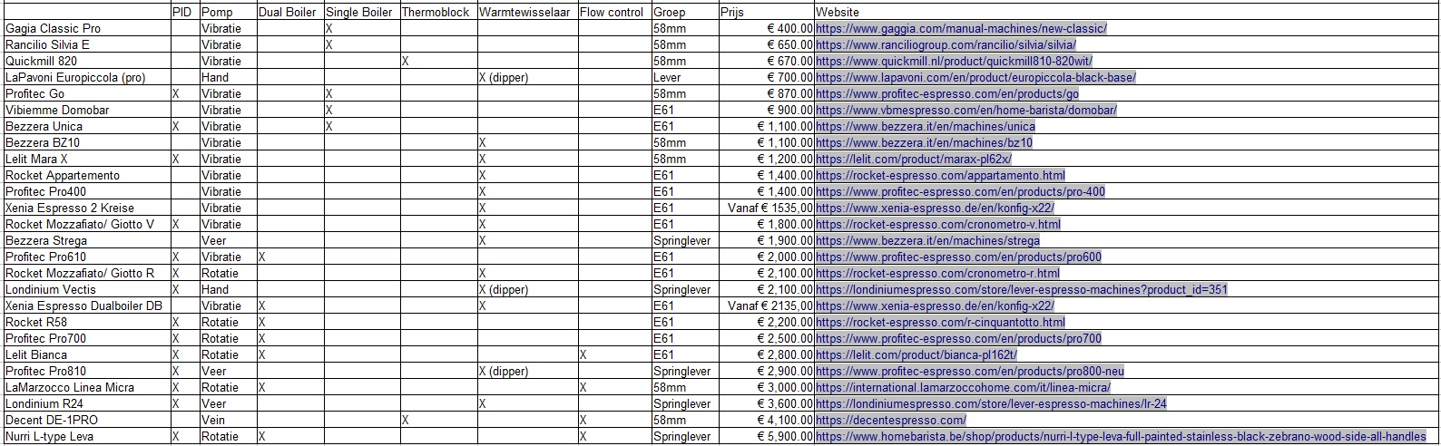 Beste (nieuwe) gebruiker. Veel mensen die Koffiepraat als kennisbank gebruiken, vragen om advies bij de aanschaf van een volgende machine, maler of combinatie van de twee. In samenwerking hebben wij geprobeerd om een lijst van machines te maken die wij kunnen adviseren.
