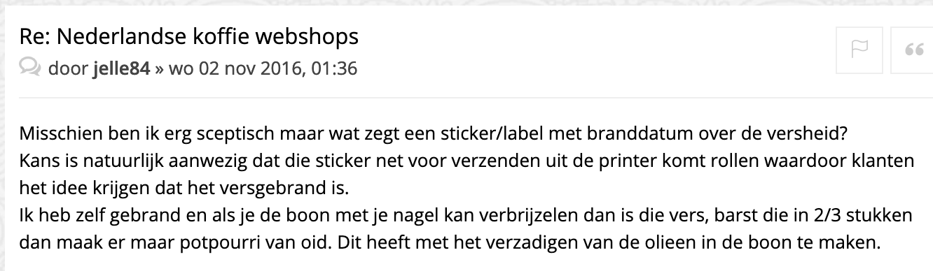 Oh heb ik dat genoemd in het verleden? Weet ik niet eens meer. Ik heb daar wel eens over gedacht om te doen en dat thuis opstarten maar in de praktijk werkt dat toch niet. Ik had een gene cafe brander maar als je wat grotere capaciteit wil dan trek je portemonnee maar.