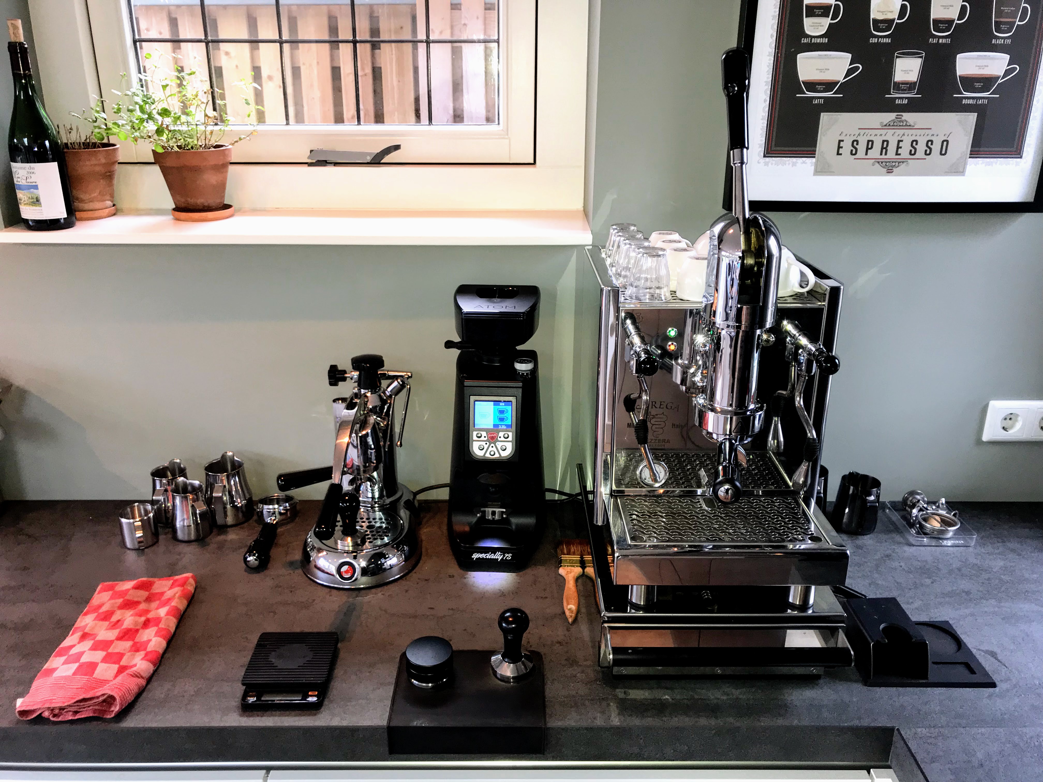 La Pavoni Professional, Moccamaster, Bialetti Moka Express, Chemex, AeroPress, Kinu M47, Eureka Atom 60