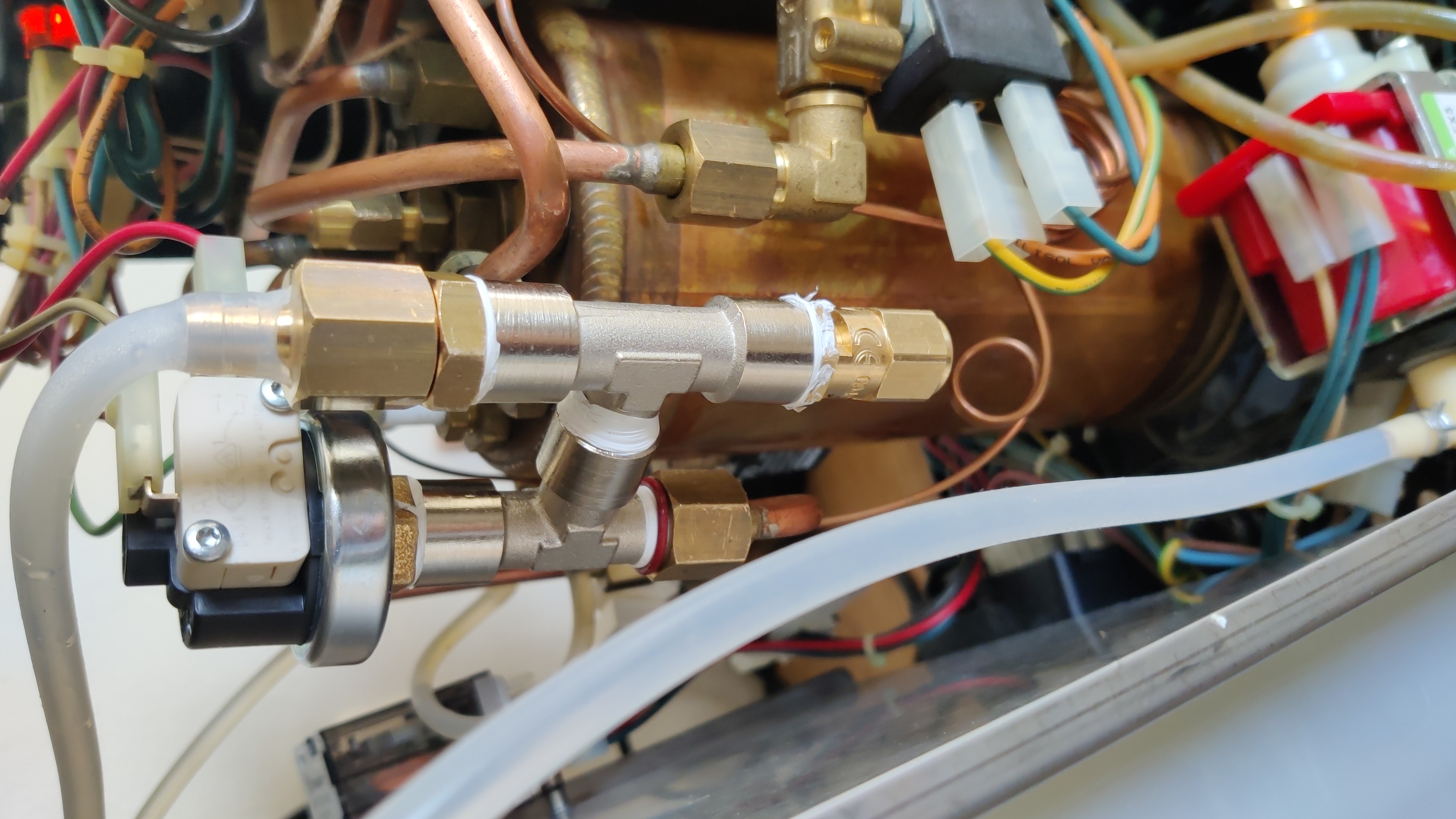 Ik heb uiteindelijk besloten de hele 'kerstboom' zoals Han hem noemt te demonteren en te vervangen door losse, volwaardige onderdelen. Aanvankelijk wilde ik dat doen op de manier zoals ook in bovenstaande link wordt beschreven, maar omdat ik de moer op mijn boiler met geen mogelijkheid los kreeg (althans niet zonder hem te beschadigen) heb ik er uiteindelijk een extra T-stukje tussen gezet. Werkt weer perfect nu, kan weer koffie zetten zonder nat aanrecht