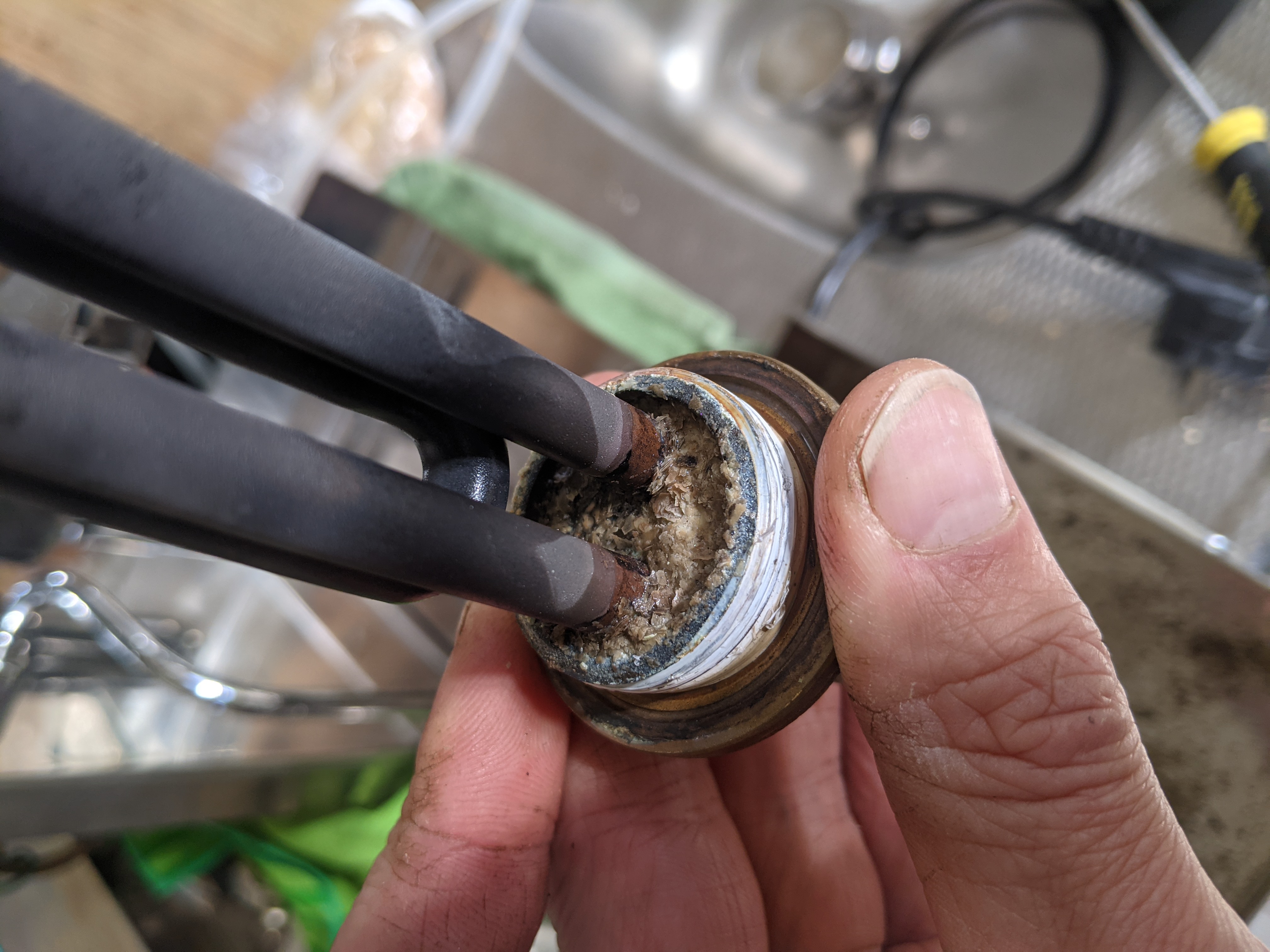 Het buisje waar de voeler van de thermostaat in zat is ook weer koperkleurig en de voeler (die soort van vast zat) is los gekomen. Het lijkt alsof hier ook kalk oid in gezeten heeft, maar als ik de boiler goed begrijp zou daar eigenlijk helemaal geen kalk moeten kunnen komen. Of zou dit verharde warmtegeleidende pasta oid geweest kunnen zijn?