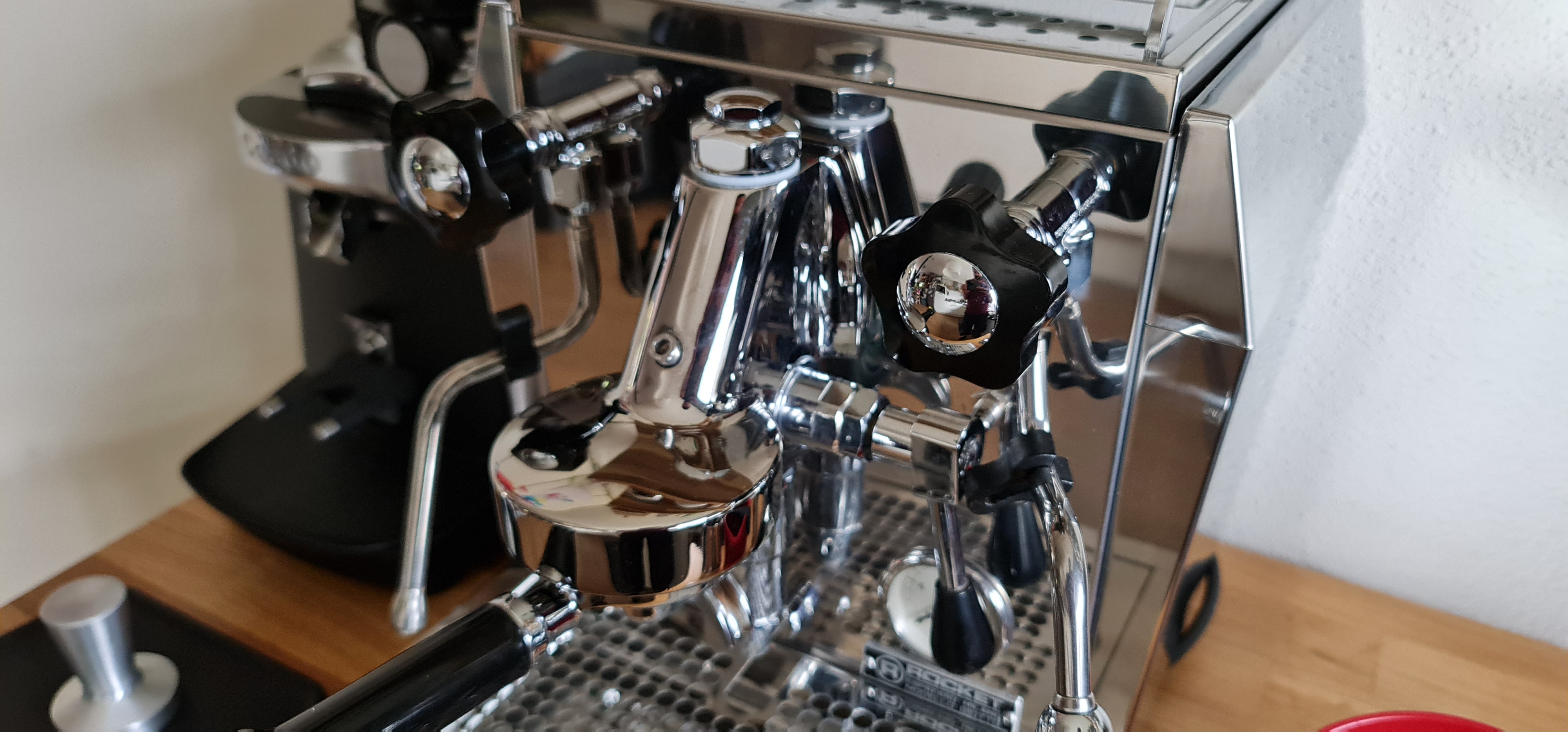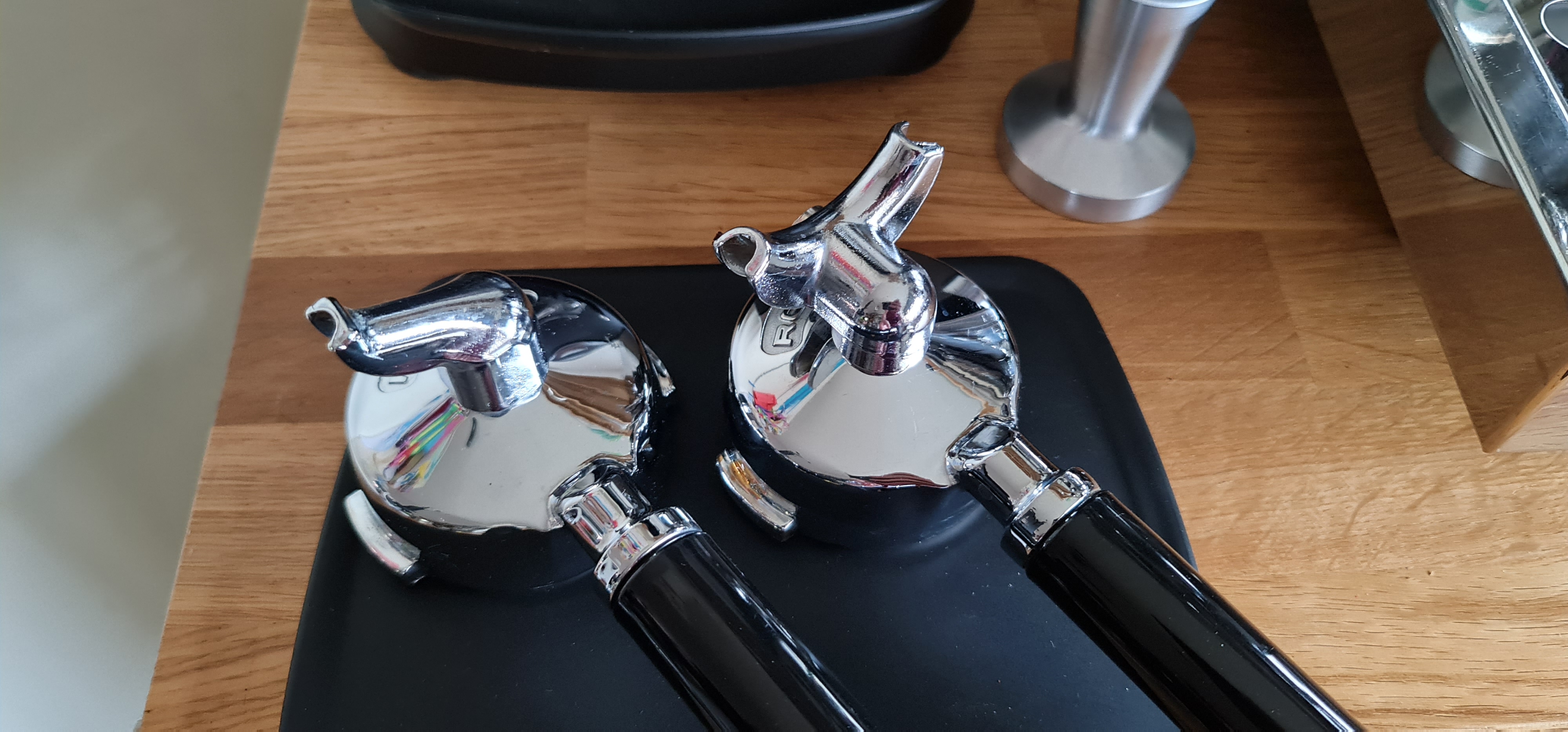 Bij de machine zitten 2 Rocket filterdragers, met enkele en dubbele uitloop.
