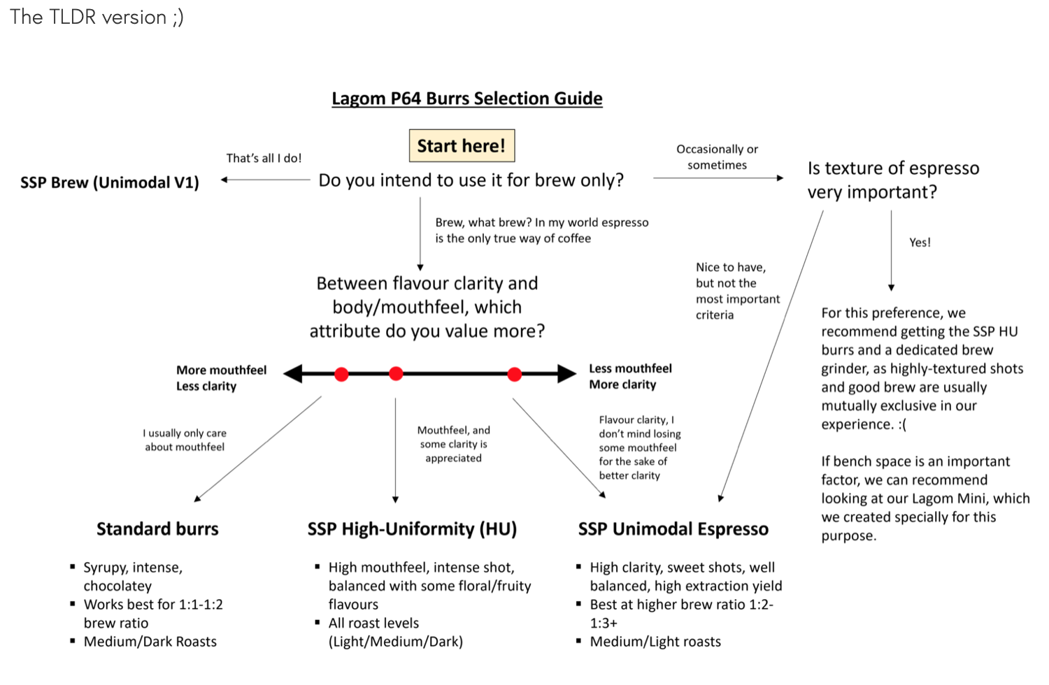 In principe is het best overzichtelijk. De SSP MP zijn goed voor filter en light/medium roast espresso. De HU voor medium/dark espresso. En wil je een wat meer stroperige espresso dan is de HU the way to go. (De oude SSP brew burrs produceren nog minder fines dan de MP en zijn tricky voor espresso: zowel qua afstellen, bereik als flow control).