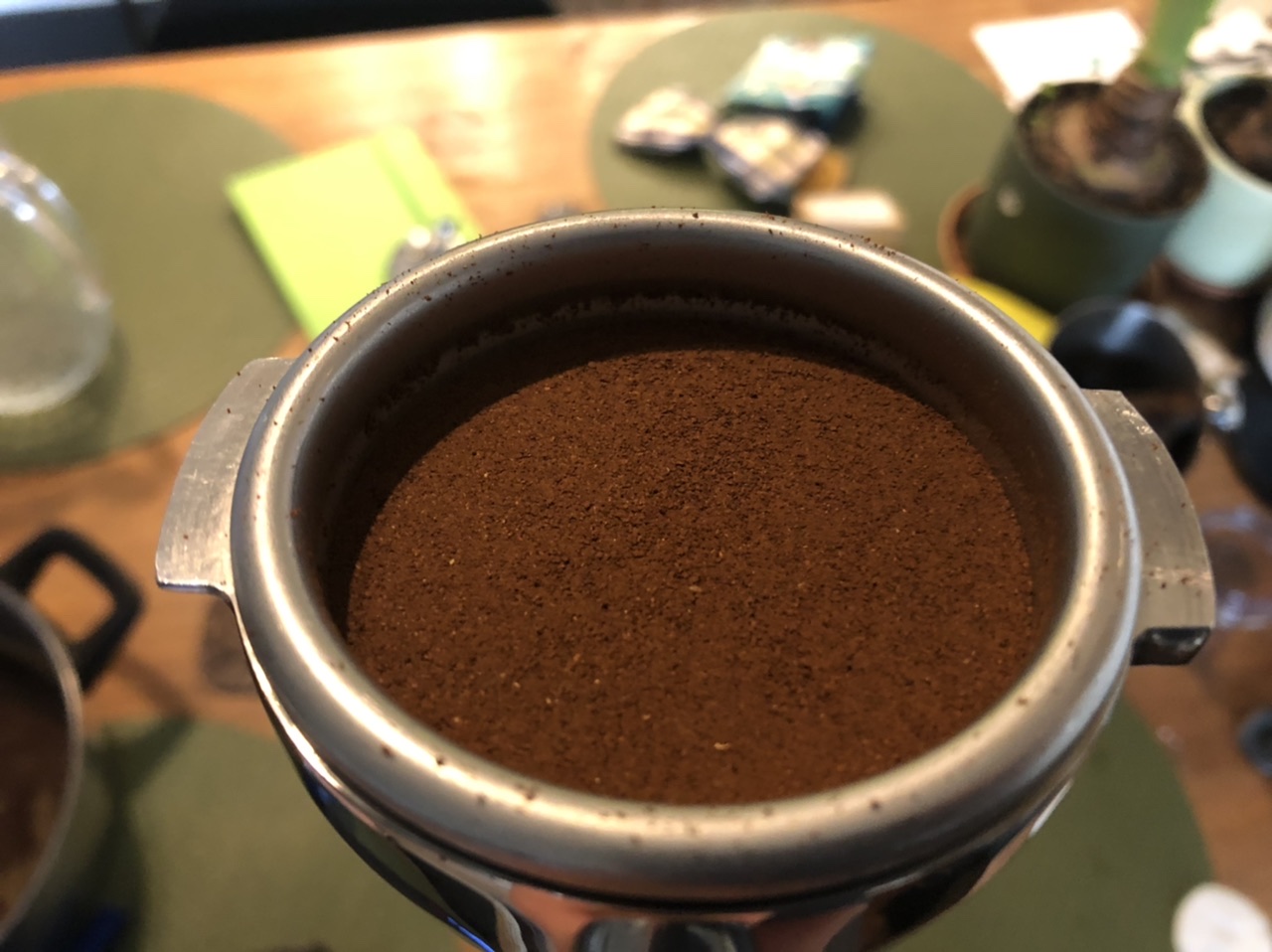 Er werd gevraagd naar een filmpje van een shot en mn puck prep. Bij deze dus een foto van het wat grovere maalsel rechtstreeks uit de maler (via dosing cup) in het filter, daarna een foto na WDT en egaliseren met zo’n draaiende koffieverdeler, daarna foto na tampen en vervolgens het filmpje.