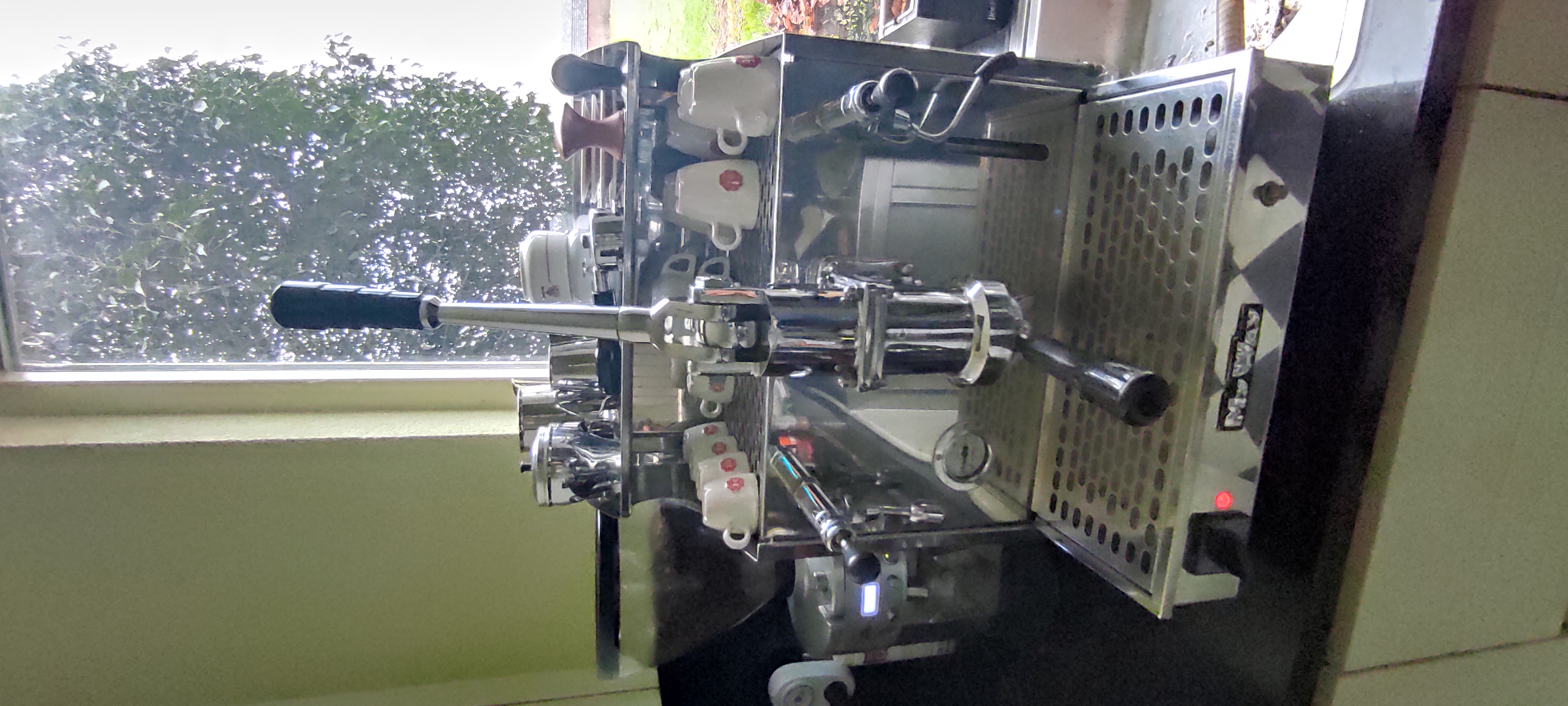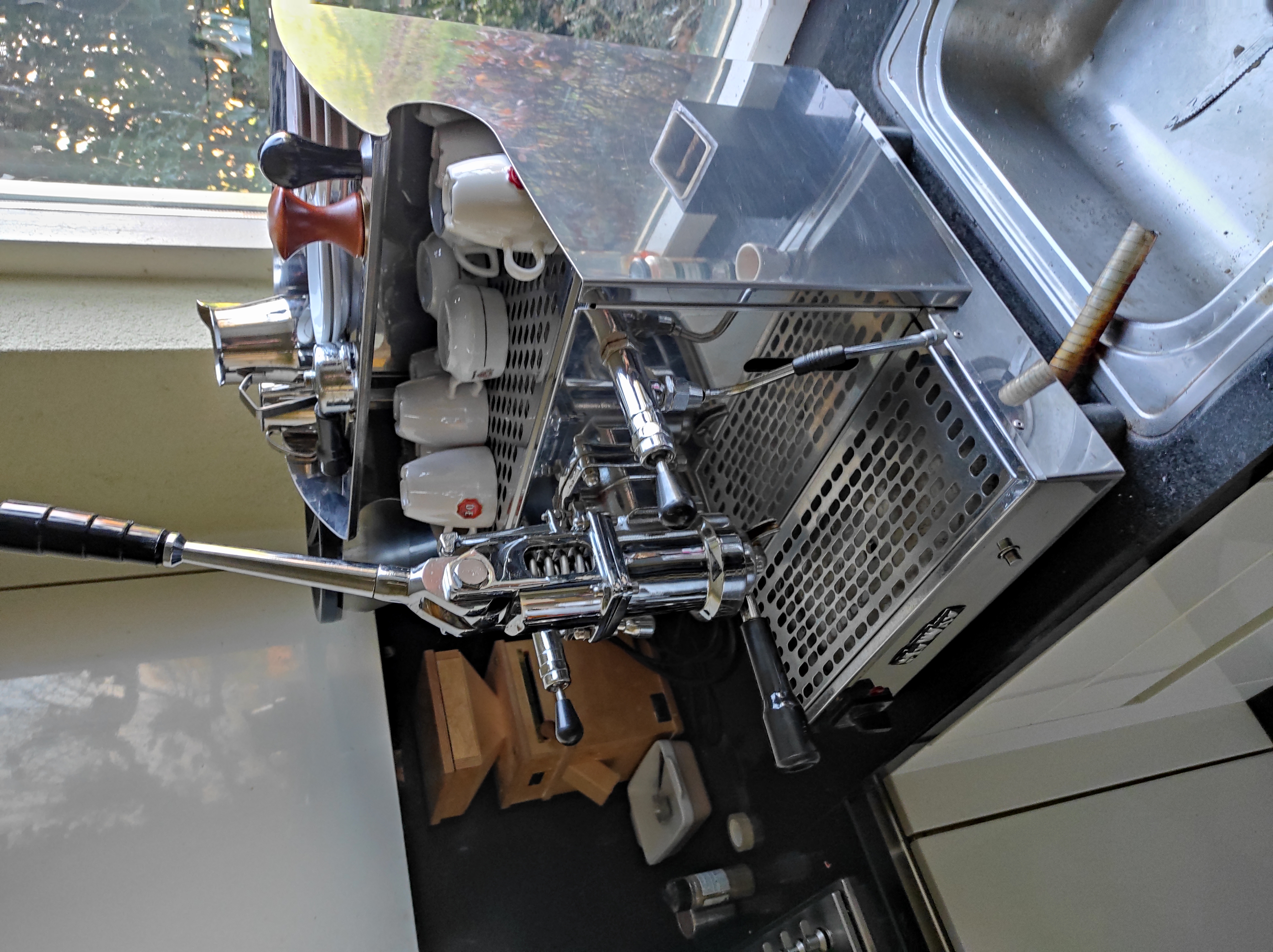 Machine is groot en weegt 65 kilogram.Oerdegelijk. Check de video. Daar is nul flex in machine bij het activeren van de lever. Machine hoort aangesloten op vast water en heeft geen reservoir of pomp. Muisstille espresso's van hoog kaliber.Oneindige,zeer krachtige stoomproduktie.