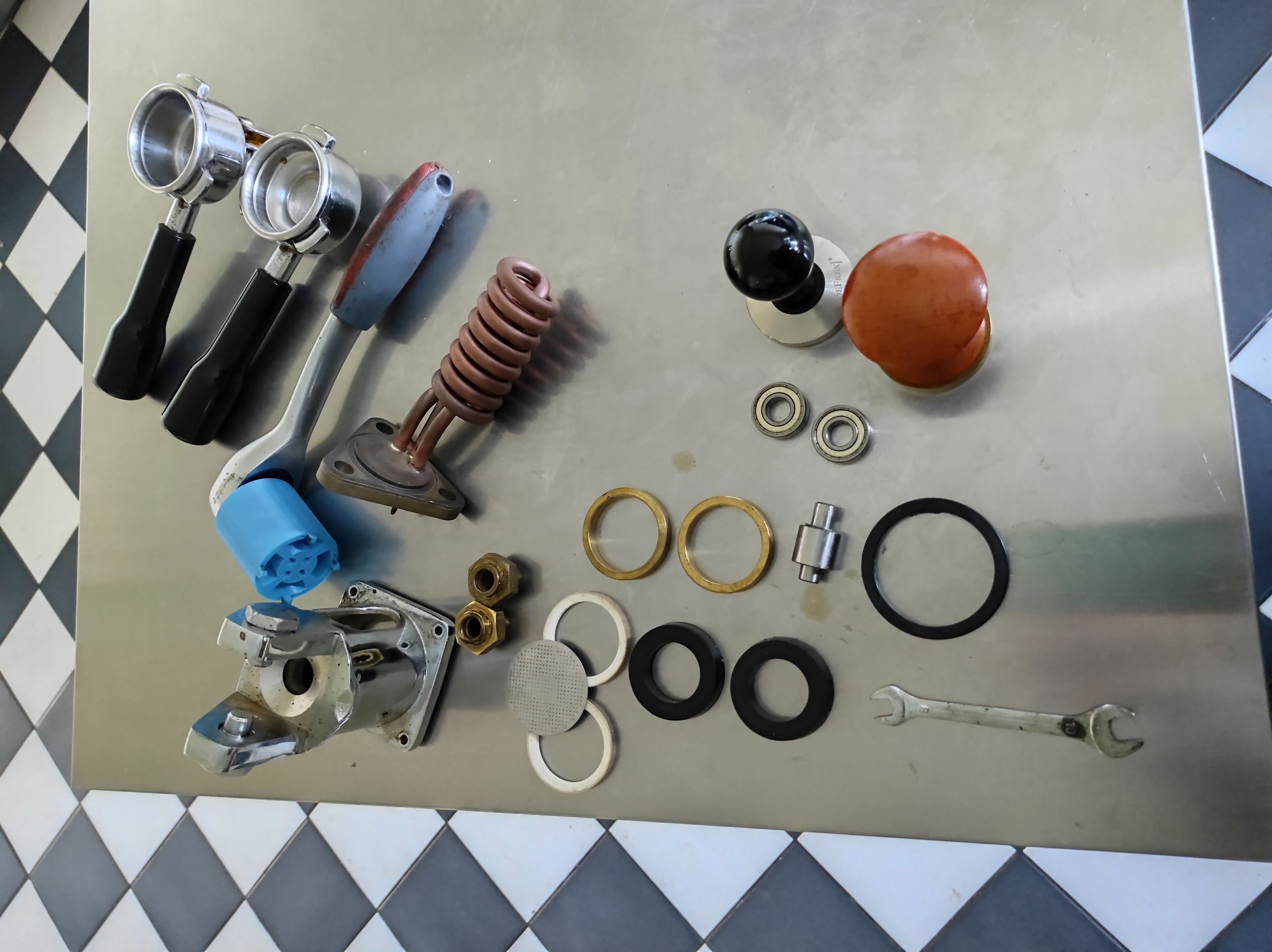 Drie portafilters,enkel,dubbel en naked. 3D geprint toolom zuiger veilig en makkelijk te verwijderen. Extra groepkop.Drie nieuwe lagers. Extra douche,extra teflon ringen en conische drukringen,twee nieuwe seals,portafilterpakking,twee tampers en fonkelnieuw verwarmingselement.