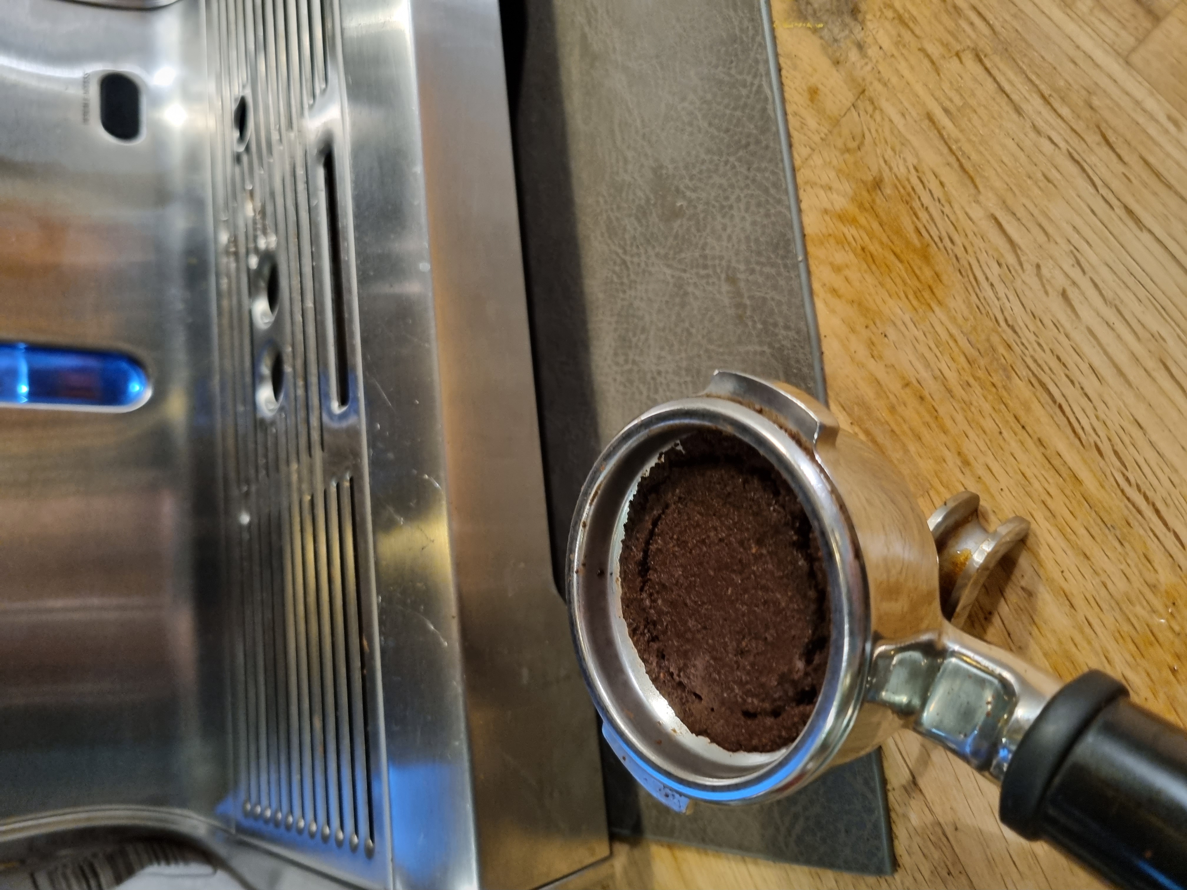 Ik gebruikte een 53mm tamper in het 58mm conisch single shot mandje; niet ideaal om te tampen. Ik kreeg niet echt iets waar ik vertrouwen in had. De koffie is wel aangedrukt maar lijkt los te liggen in het mandje. Zie ook mijn vorig resultaat waar de hele droge puk aan mijn tamper bleef kleven...