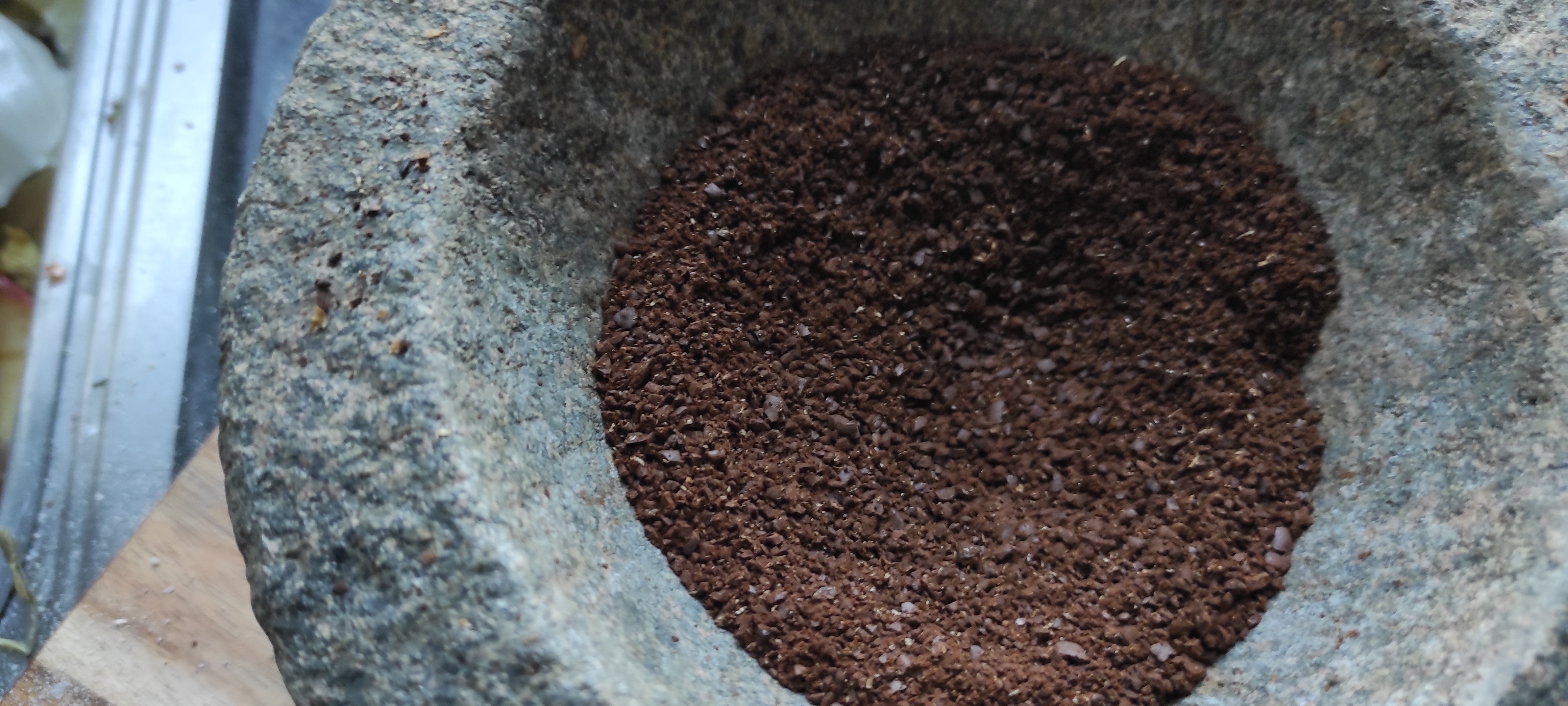 cremalover schreef:Ik ga eens wat nieuws proberen.Het vijzelshot.Koffiebonen fijnmalen met vijzel.Misschijn geeft het residu van knoflook,laos,kemiri,trassi etc een extra touch aan de koffie.Zou met een Indonesische arabica mooi moeten blenden.