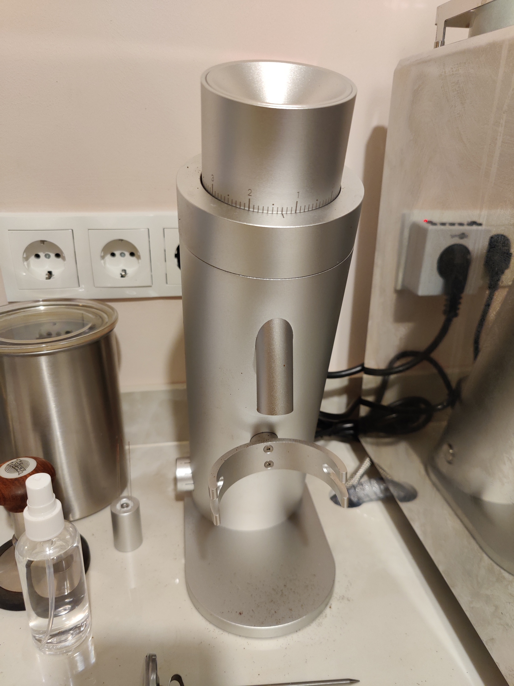 Allereerst vind ik hem beeldschoon, nog mooier in het echt dan op foto's. Met zonlicht heeft ie een lichte sprankeling op de behuizing, moeilijk om uit te leggen maar wel erg tof. Het kunnen instellen van de RPM van de maling is iets waar ik nog niet mee heb geëxperimenteerd maar binnenkort wel mijn tijd voor wil nemen. Voor nu heb ik hem op de een na hoogste stand, dus ik geloof dat dat 1200 RPM of iets dergelijk is. Met de Braziliaanse boontjes van Koepoort maakt ie verrukkelijke espresso, echt om van te genieten.