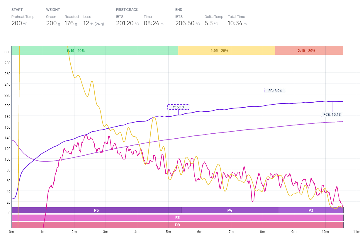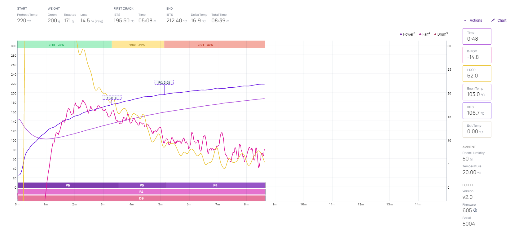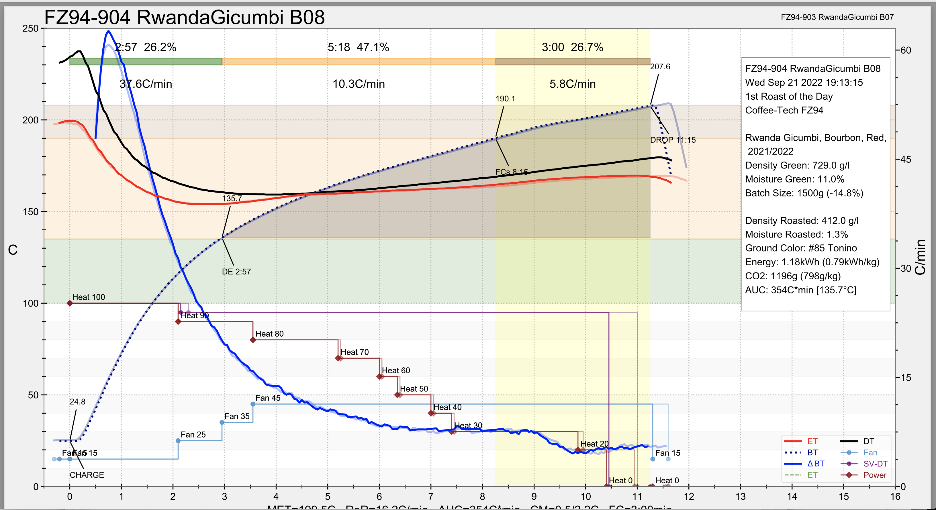 De vorige keer gingen de bonen er 2:30 na first crack uit. Nu na 1:30 en 3:30.