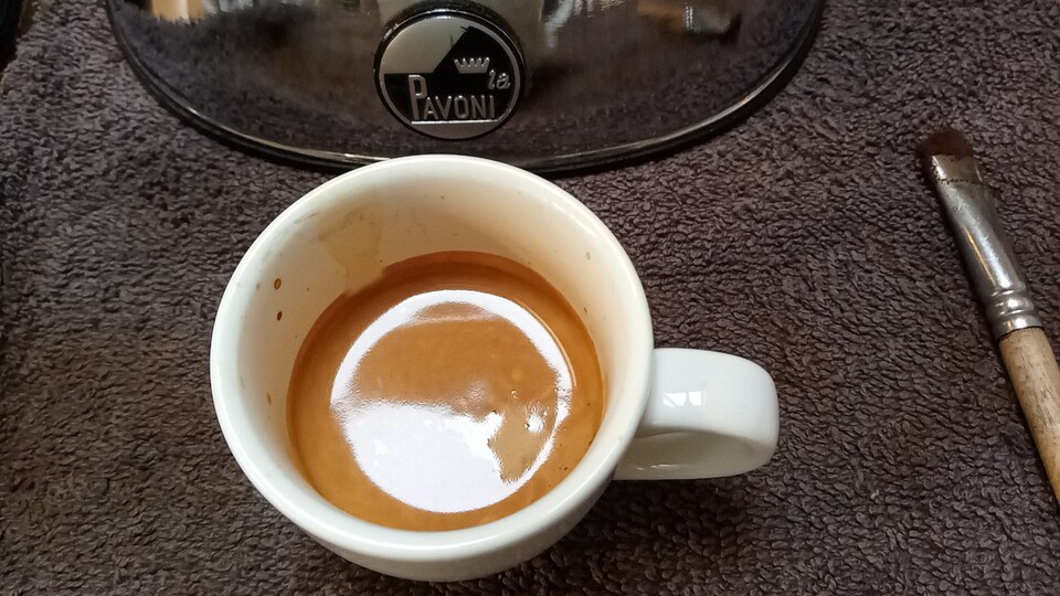 Maalgraad iets grover dan voor de Malabar van andere branders, 13 gram in, 27 gram uit in 40 seconden. Op de Pavoni.