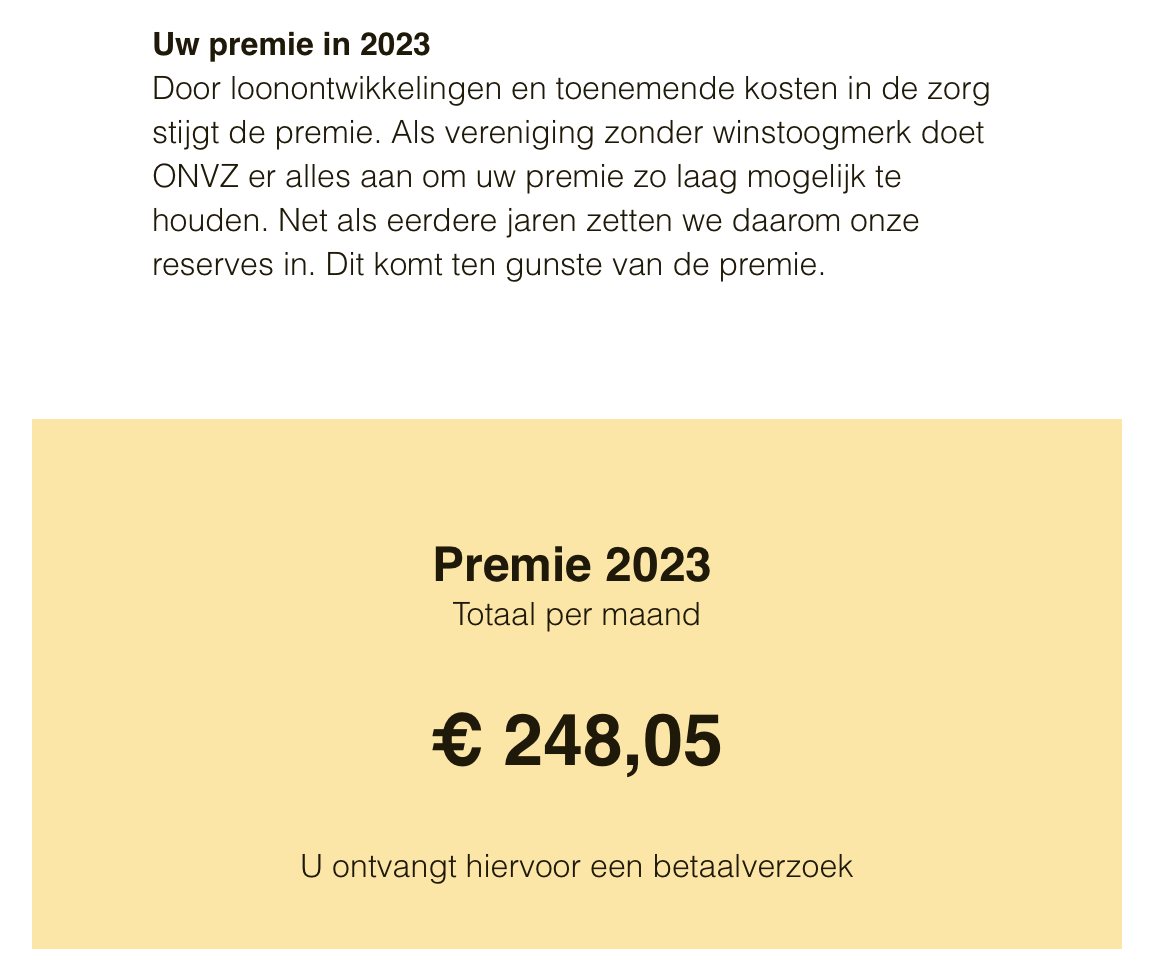 Wij zijn met twee personen, een hond en een kat. Ons termijnbedrag dat we maandelijks betalen is per 1 oktober € 287. Wordt in januari weer hoger.