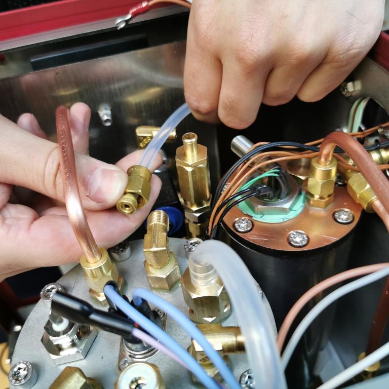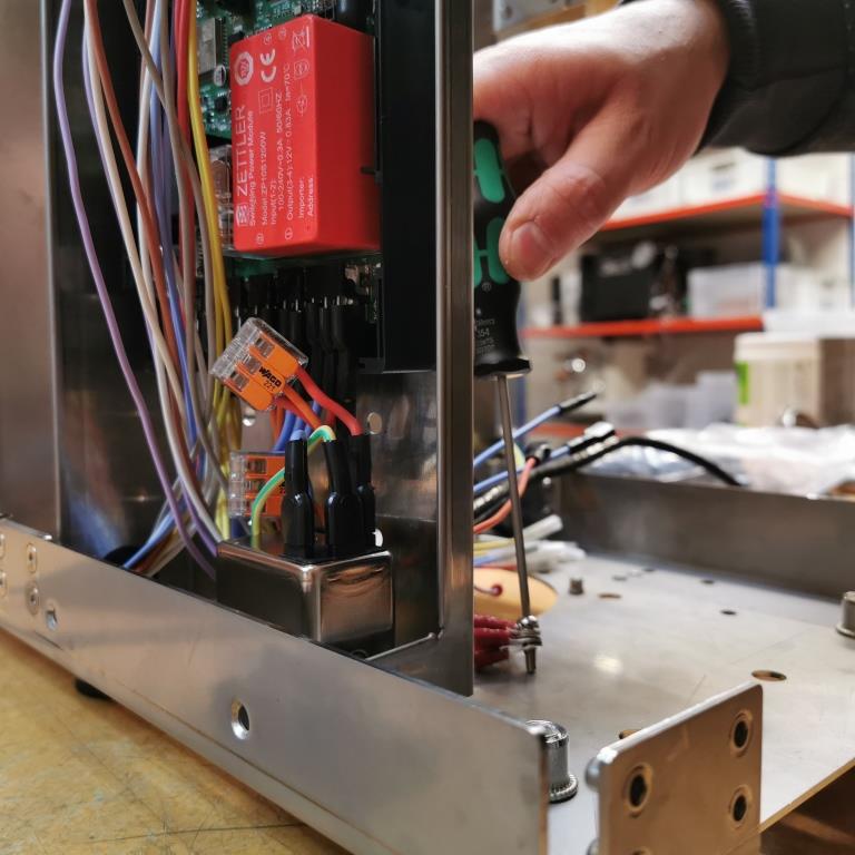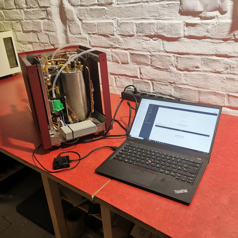 So for the time being, we went with the traditional boiler and a relatively massive brew group. The brewing kettle is dimensioned in such a way that it holds enough water for the espresso-pulling (5 times the amount of a double draw). It thus ensures that there are no fluctuations due to the flow rate. The brew group is given a way to monitor and influence the temperature.