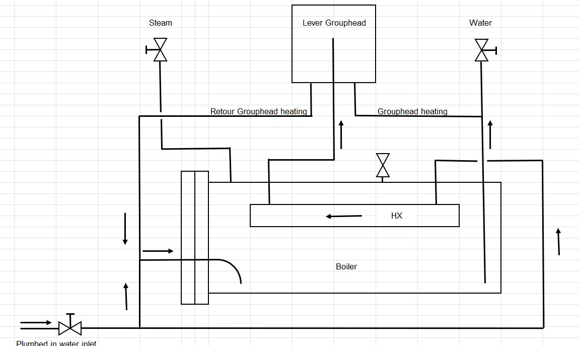 De groep lijkt die van een Bezzera B2000AL, maar ik zie 1 groot verschil: de groep wordt verwarmd vanuit de boiler, niet vanuit de HX.