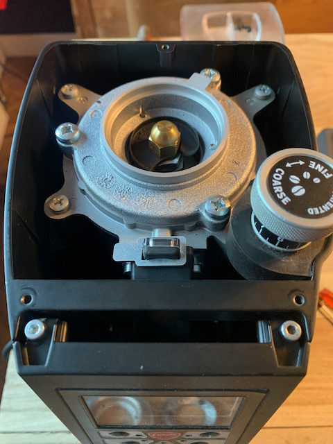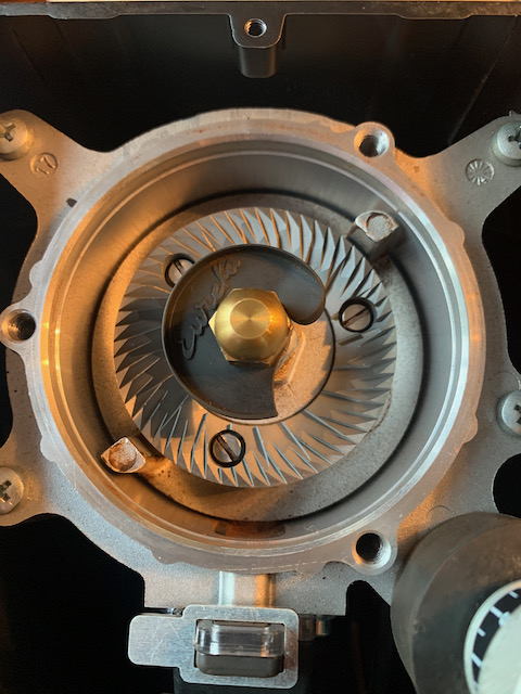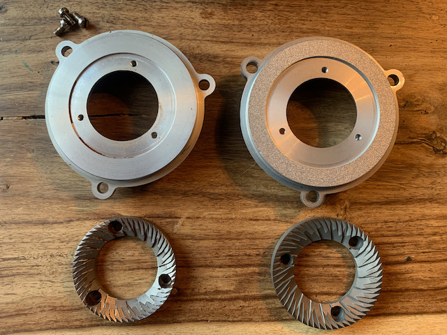 Nu heel benieuwd naar de resultaten en misschien smaak-verschillen, dus die ga ik de komende tijd ervaren. In elk geval verwacht ik een hogere maalsnelheid én minder retentie omdat er (8%) minder open ruimte is tussen schijf en behuizing én omdat de wipers in de maalkamer effectiever worden. Dat laatste is ook al duidelijk zichtbaar op de foto's.