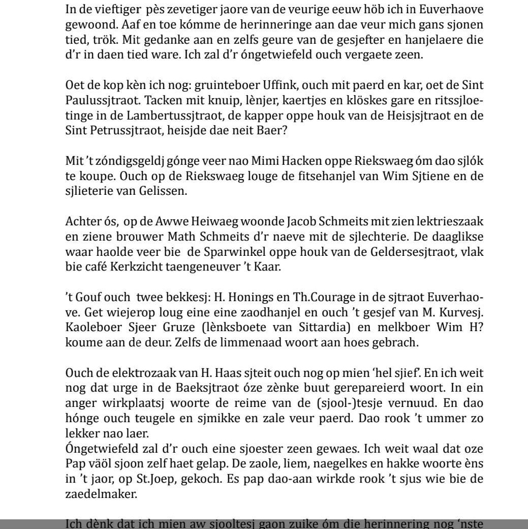 Vroeger als we met de kinderen gingen logeren bij de ouders van mijn vriendin dan las ik in de krant in Enkhuizen ook zulke herinneringen in de lokale taal. Daar was het West-Fries. We hadden ook een langspeelplaat van een vrouw die allerlei grappige verhalen in die taal vertelde. Een wijze opmerking daaruit was tegen een man die zich zorgen maakte dat zijn kleding niet correct was.