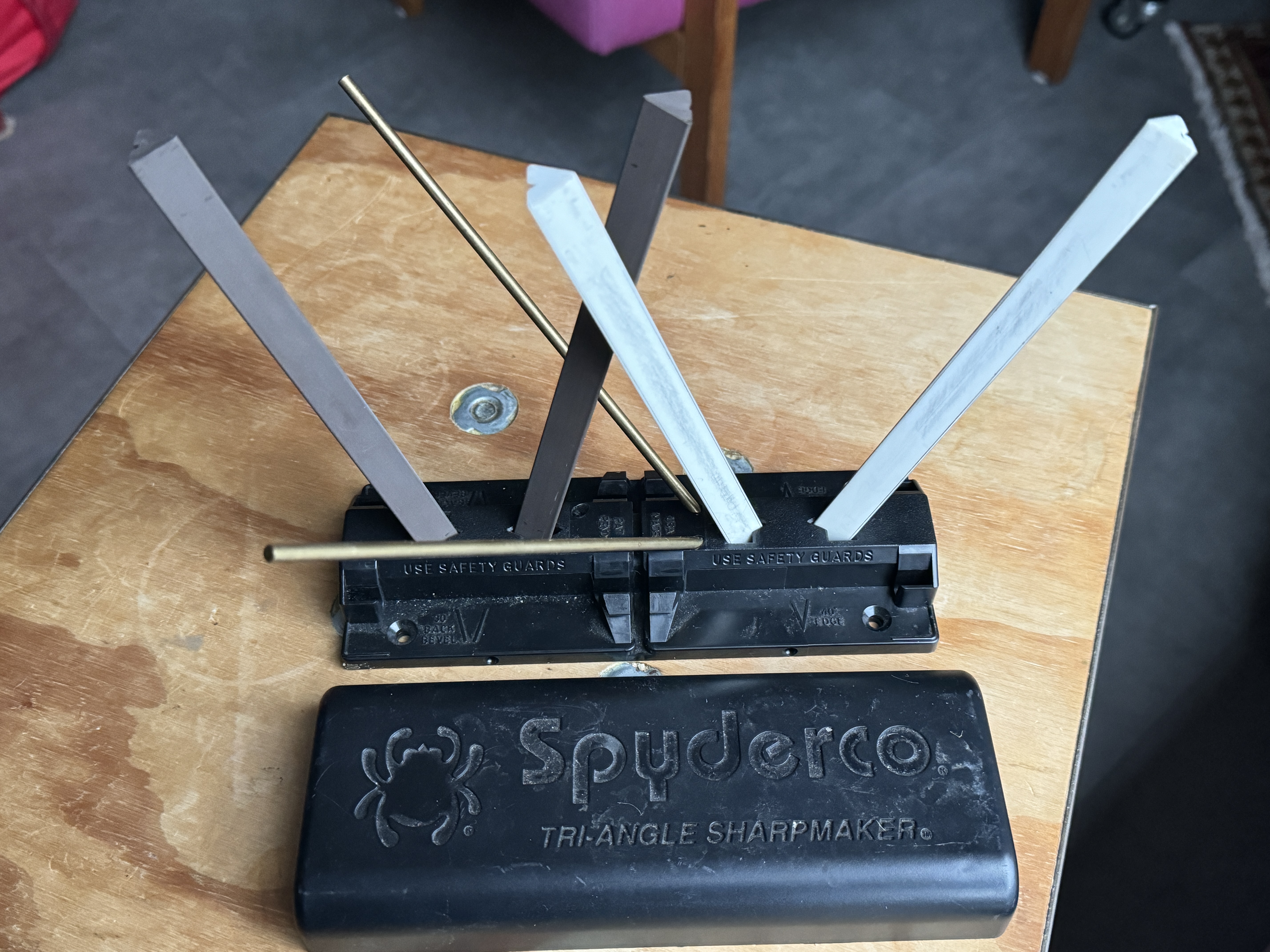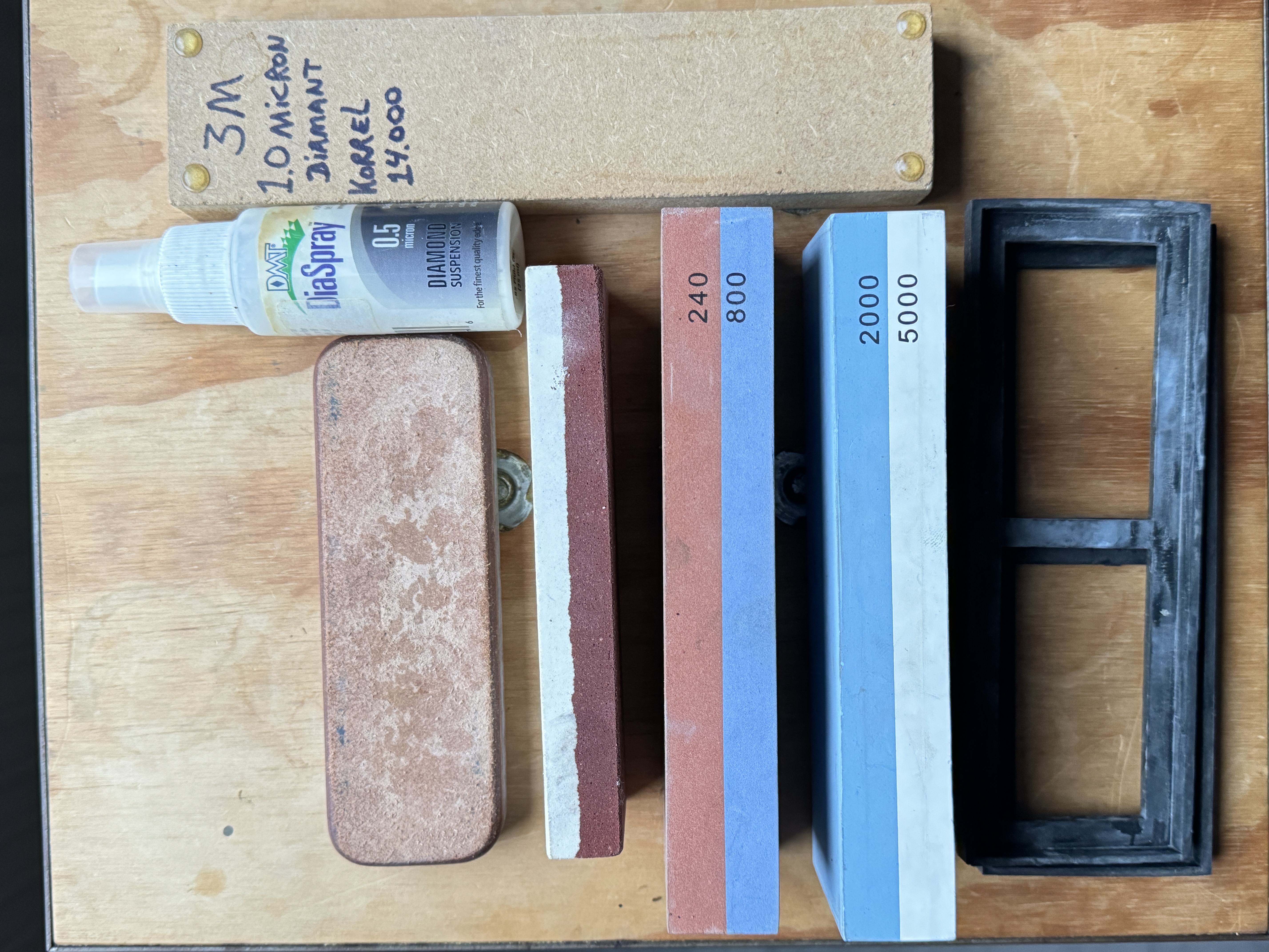 Heb ook gelijk 3 slijpstenen gekocht om een oud kapot mes te reparen en de rest te kunnen onderhouden. De meest ruwe slijpsteen (220) heb je vervolgens ook nooit meer nodig. Gister heb ik na een jaar mijn messen opnieuw geslepen en wat een genot om mee te werken daarna.