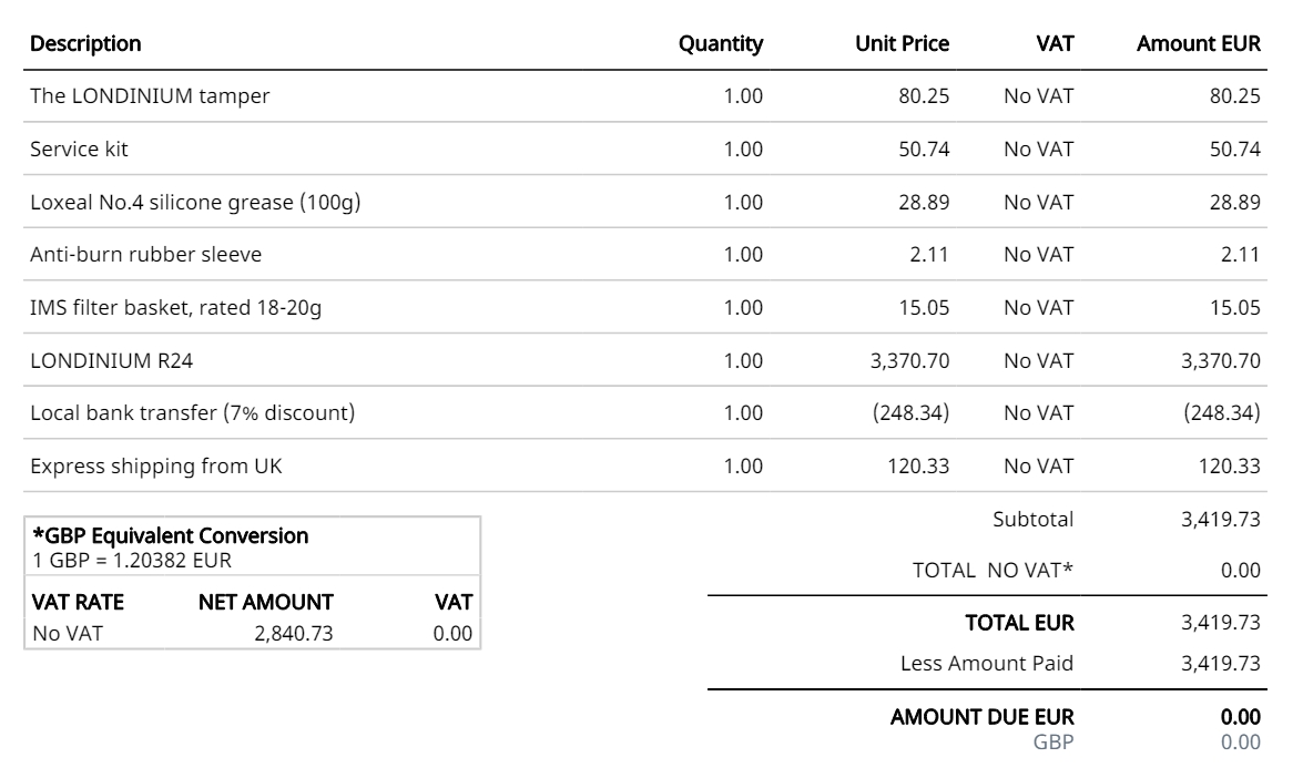 In april 2022 betaalde ik € 3.419,73 (wisselkoers toen: 1 GBP = 1,20382 EUR). Dat was voor LR24, enkele accessoires, 'express shipping from UK', betaalkorting (ivm bancaire overboeking) en excl. btw.