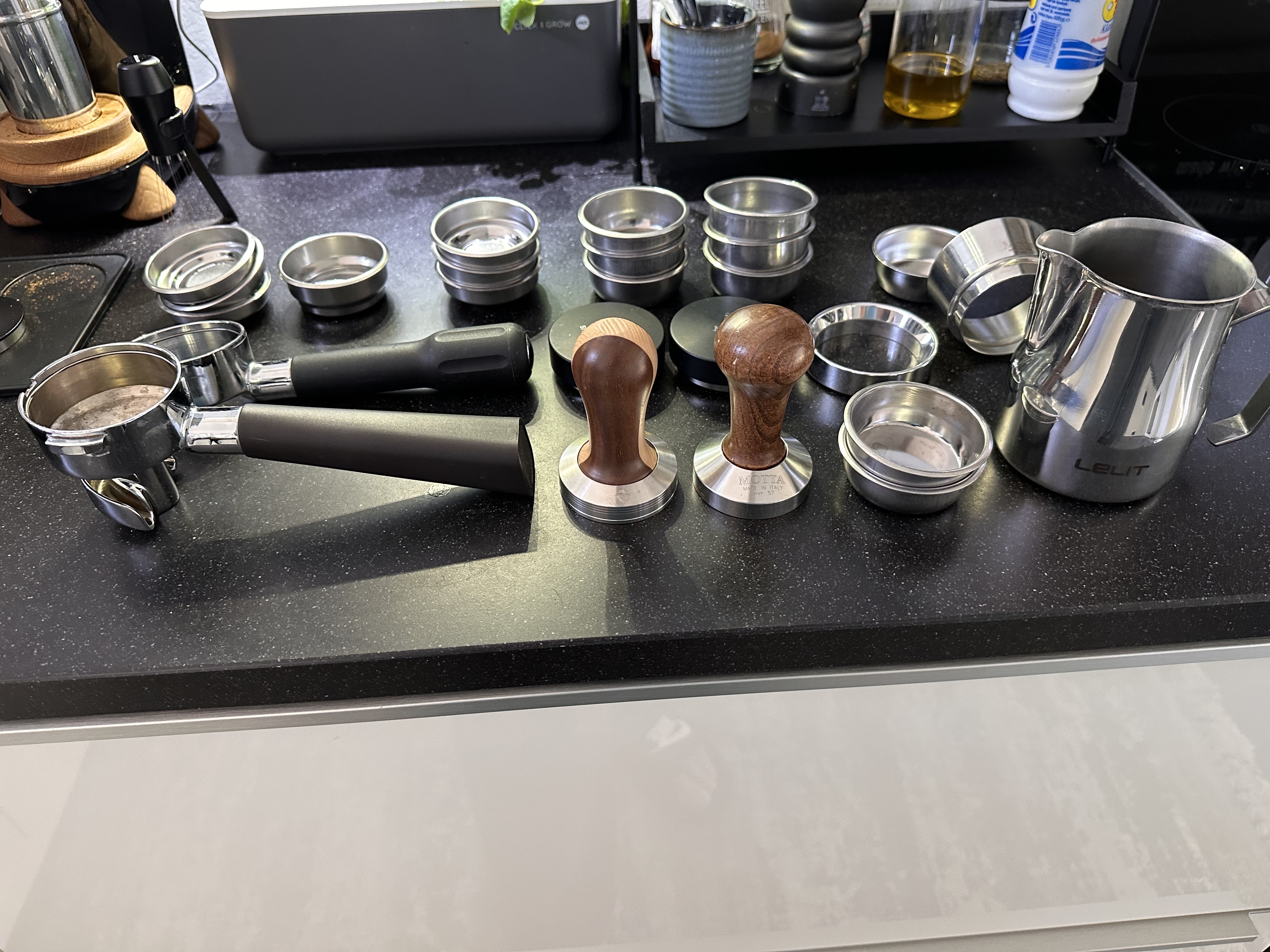 De meeste accessoires kreeg je er gewoon bij (double spout porta, de lelit baskets, tamper als extra optie)