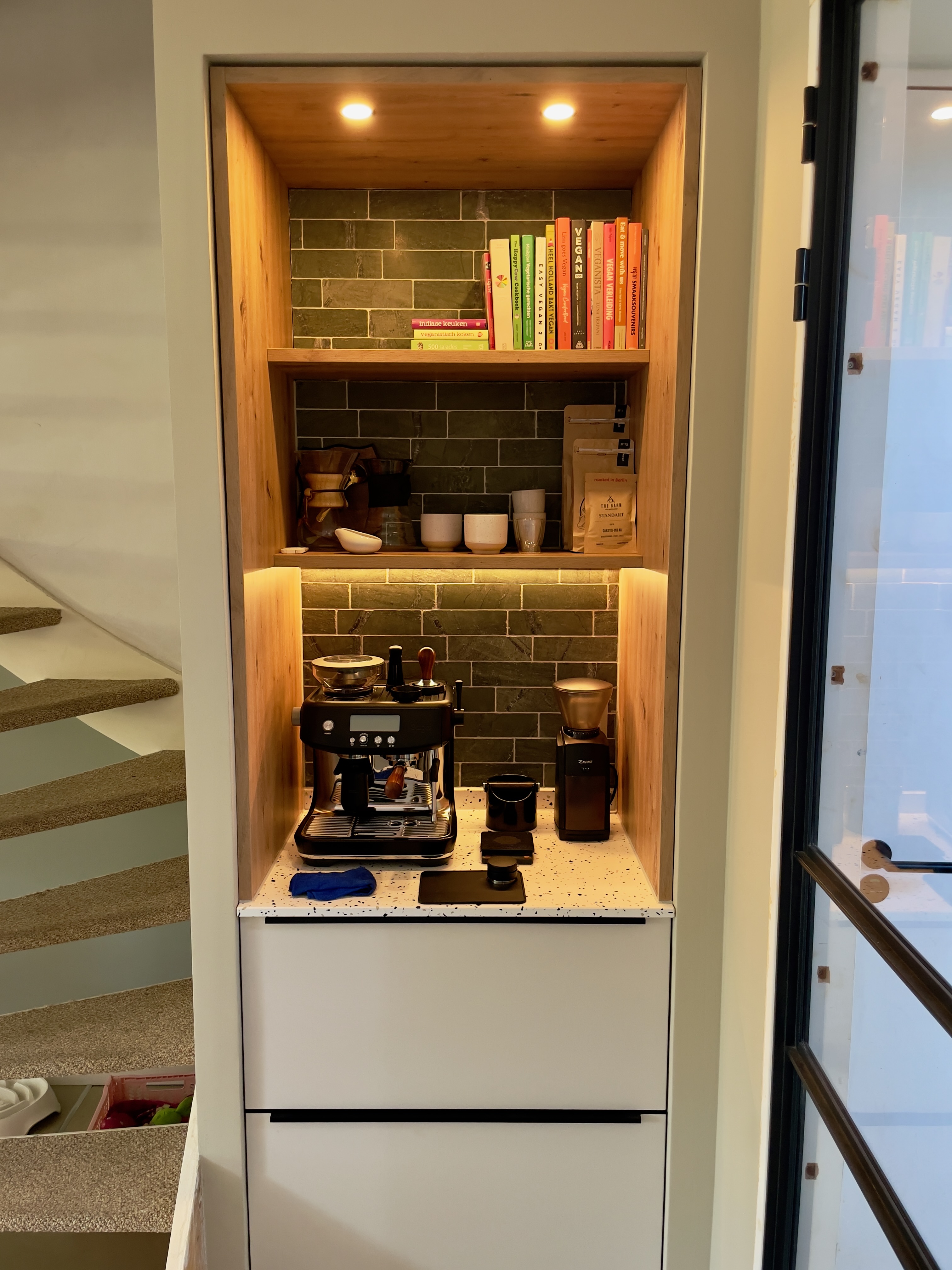 Ook nog even een fotootje van mijn setup toegevoegd. Bij het verbouwen van de keuken hebben we een mooie koffiehoekje weten te maken. Voor nu alleen voorzien van stroom, maar op termijn wil ik er misschien nog een wateraansluiting en afvoer maken, die lopen direct achter de kast langs dus zijn via de achterzijde van de kast relatief eenvoudig te bereiken!
