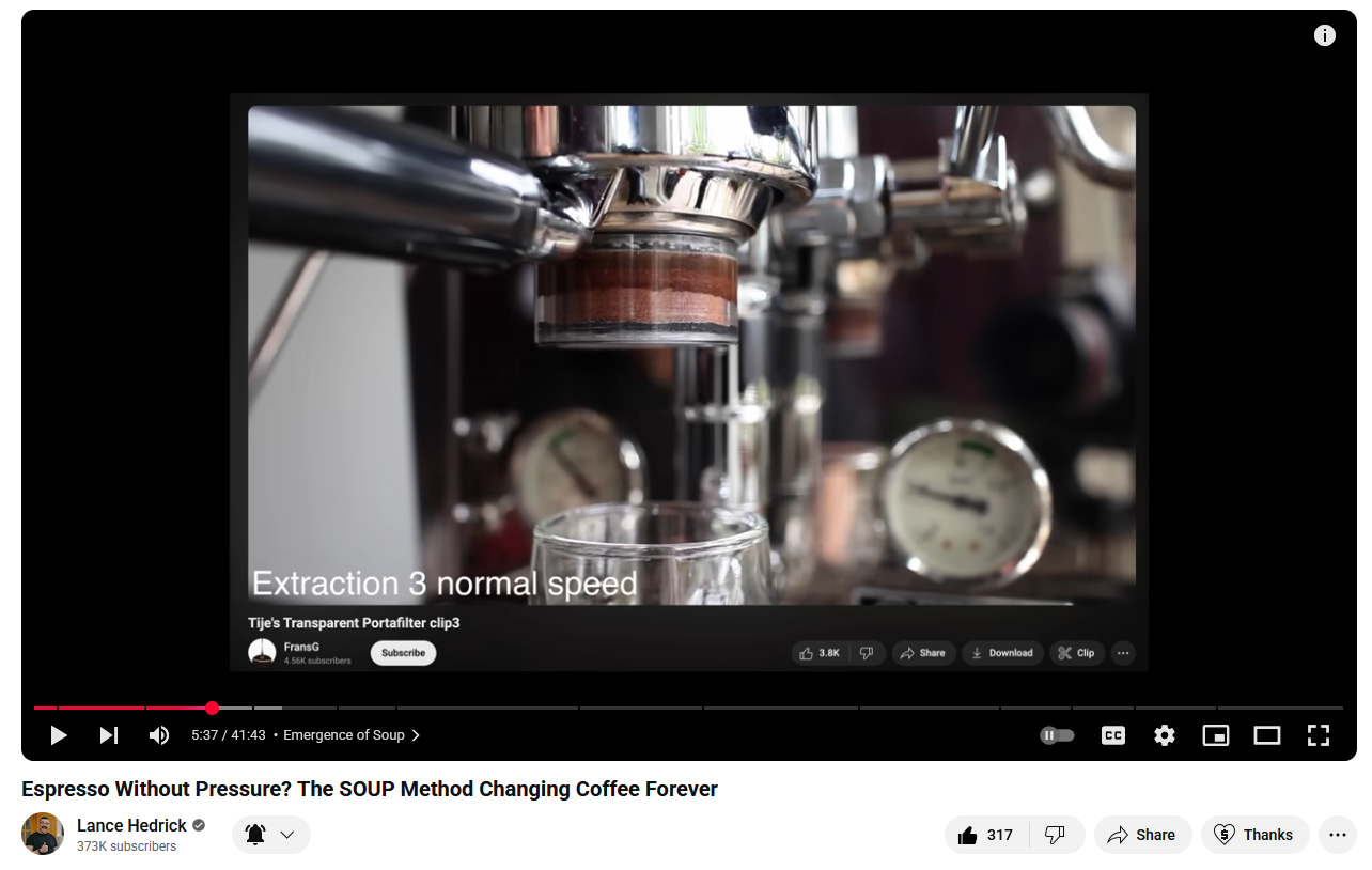 Mischa123 schreef:Ik zat het nieuwste filmpje van Lance Hedrick te kijken over zijn techniek van "Soup" espresso's voor light roasts. Toen herkende ik opeens het filmpje van @fransg. Toch leuk om even gespot te hebben :) Verder interessant filmpje om te kijken als je veel light roast espresso drinkt. Ik ga de techniek in ieder geval eens proberen.