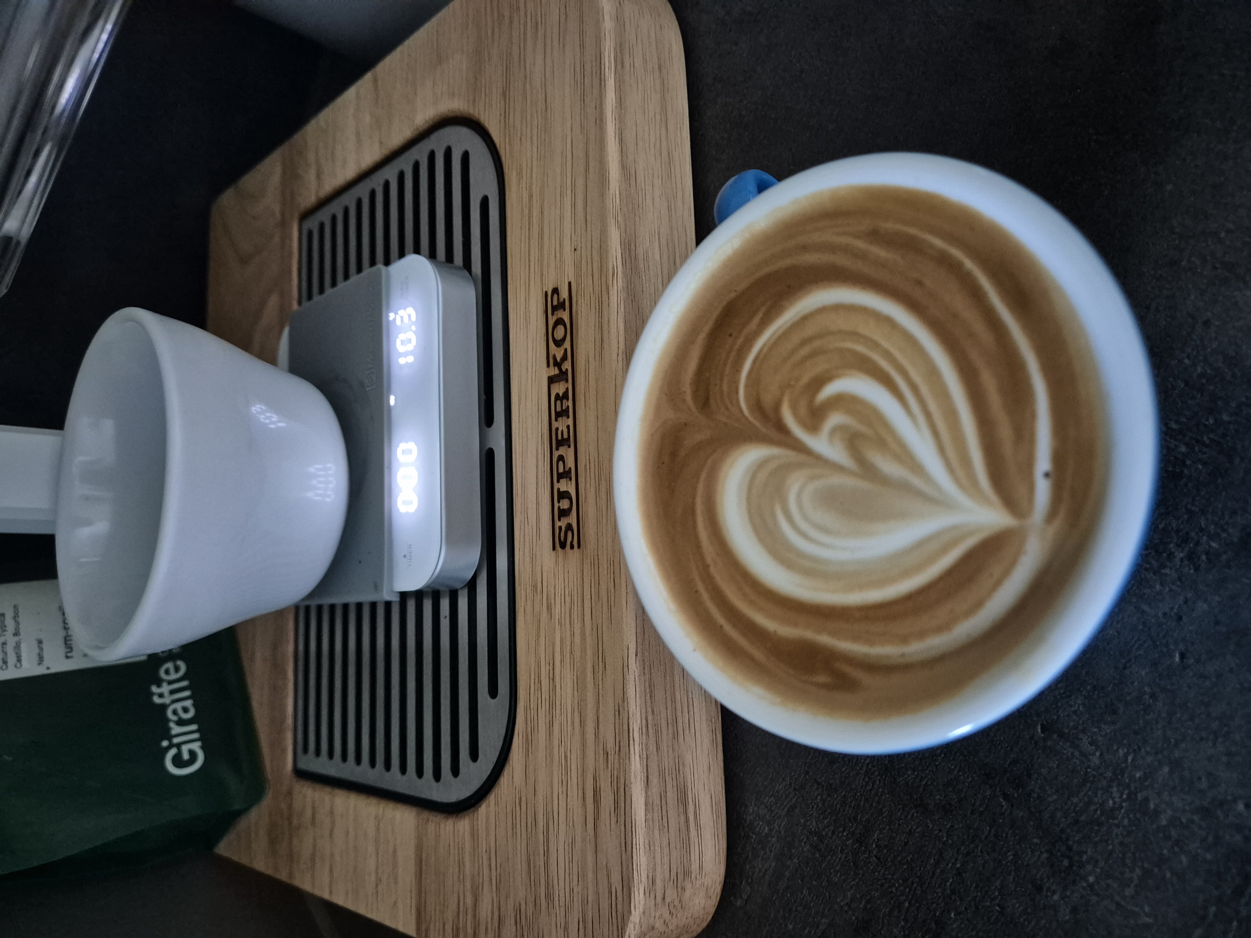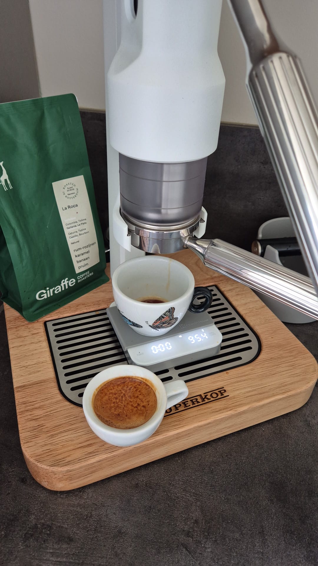 De machine zit erg degelijk in elkaar geschroefd en het resultaat in het kopje mag er zijn. De smaak is vrij zacht en het mondgevoel aangenaam. Over het design ben ik ook te spreken. Mijn Superkop is gezien de eikenhouten basis en het witte frame een mooie mix van Scandinavisch en industrieel design. Hou er wel rekening mee dat de machine met de lever naar boven best hoog is. De lever moet helemaal omhoog om na je shot de trekveer te activeren die de piston omhoog trekt. De totale hoogte is dan iets van 72 a 73 cm.
