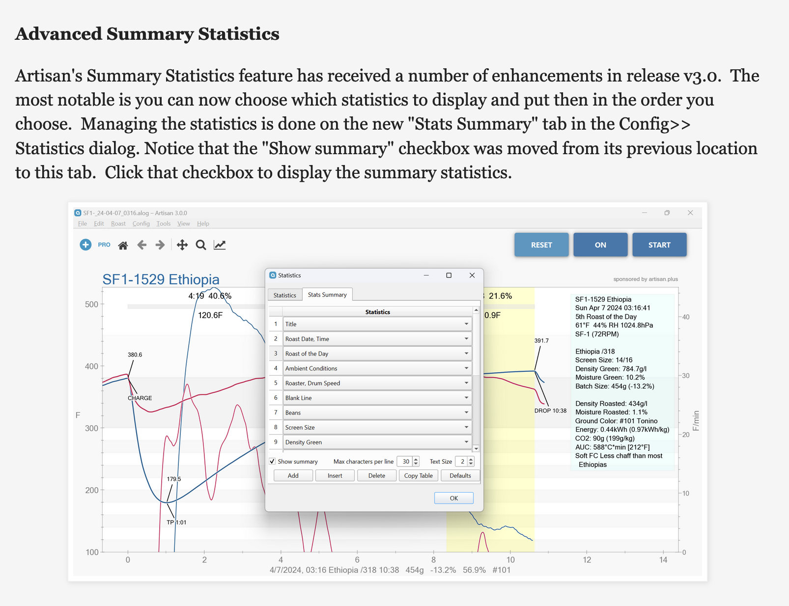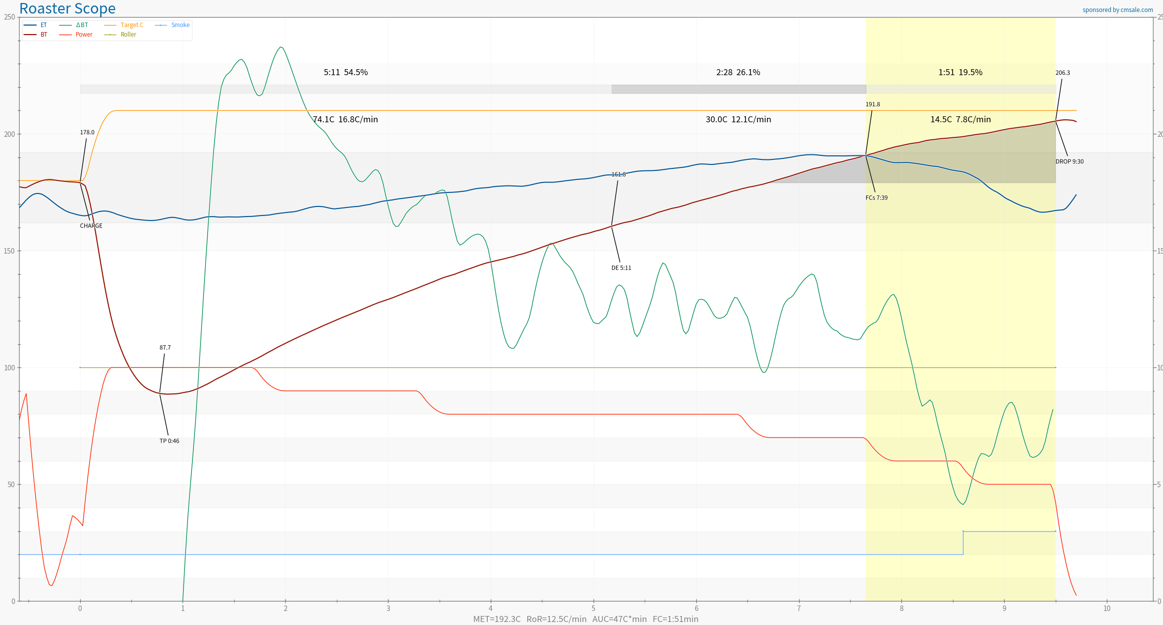 Ter referentie; bij batches van 600g gebruik ik maar zo'n 60-70% van het vermogen en bij batches van 800g ca. 90-100%, wat ik gedurende de roast (rode lijn onderin) afbouw om te voorkomen dat de temperatuur te ver doorschiet: