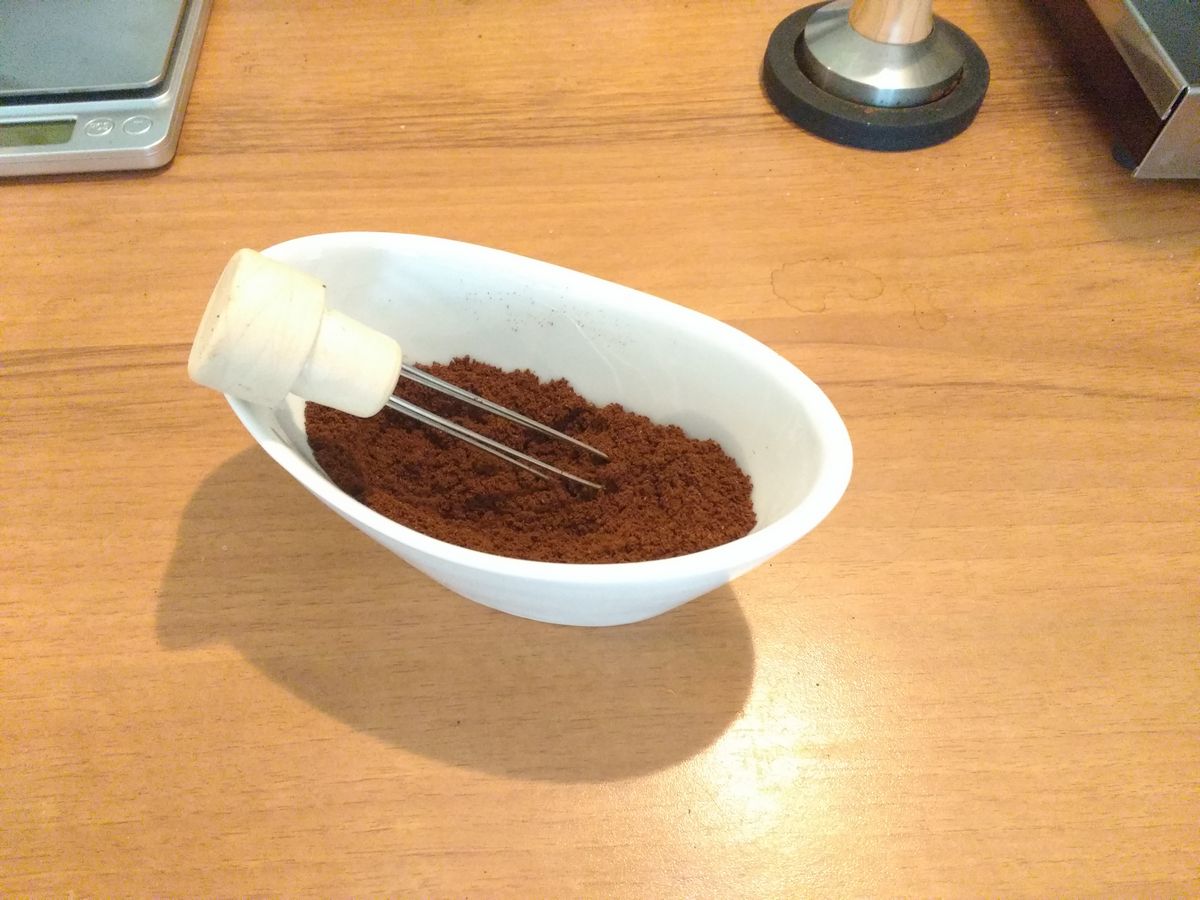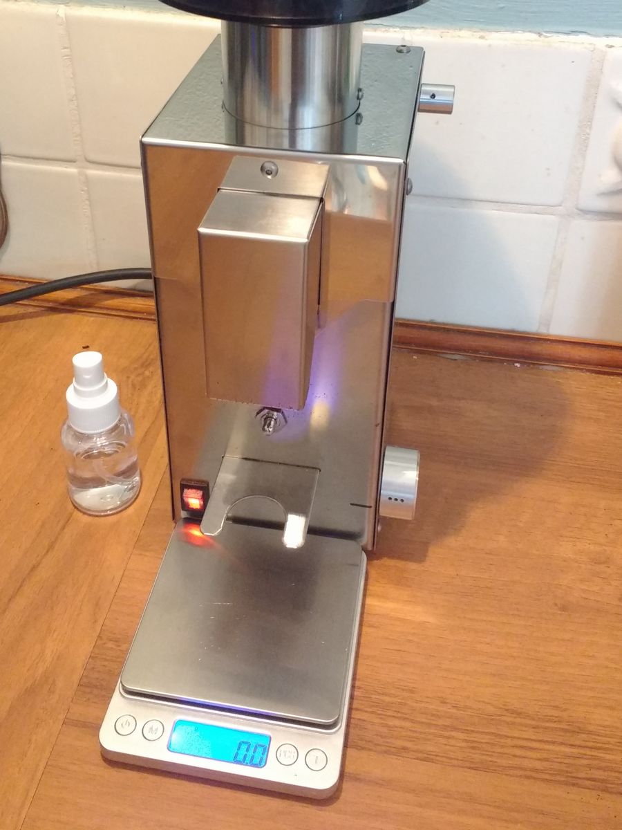 Ik heb een simpel zilverkleurig weegschaaltje van 10x15cm aangeschaft dat precies bij de Bezzera maler past. Misschien haal ik de portafiltersteun nog eens van de maler af zodat ik direct op gewicht kan malen.