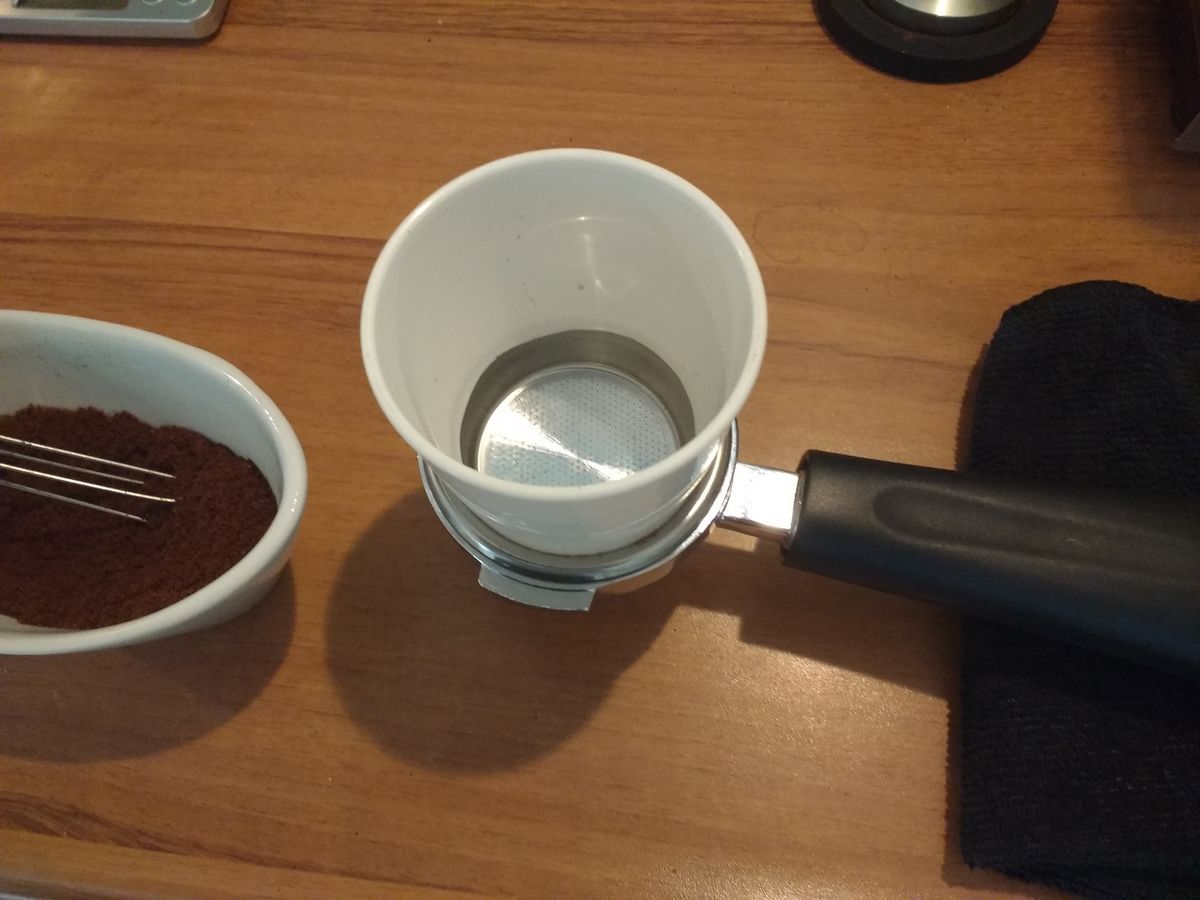 Verder heb ik een doseringsring gemaakt door de bodem uit een laag plastic kinderbekertje te snijden (dochterlief: hee, wat doe je met mijn beker?). Precies de goede doorsnede zodat het nu makkelijk is om het maalsel netjes in de portafilter te krijgen. Als ik de portafiltersteun van de maler haal kan ik daarmee zelfs meteen in het filter malen zonder te morsen. Maar omdat ik veel van bonen wissel zal ik toch vooral op gewicht malen.