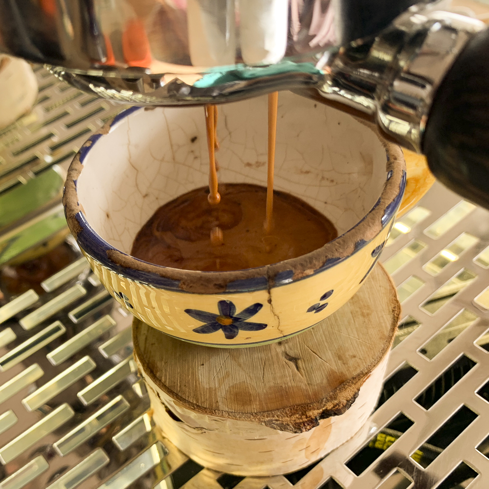 Peter had ook voor de afwisseling een vervanging bij zich voor de rubber ijshockey-puck die ik rondom de machines gebruik als ondergrond voor tampen en espressokopje. Deze is gefabriceerd van natuurlijk materiaal: