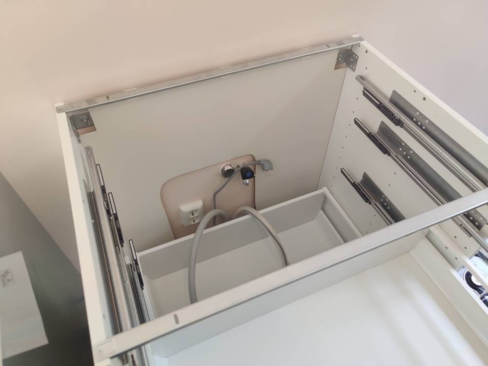 Vooraf wat doorvoeren in je blad maken. Dat voorkomt achteraf boren en kloten. Dan kun je met je stroom en water allemaal onder het blad aansluiten.