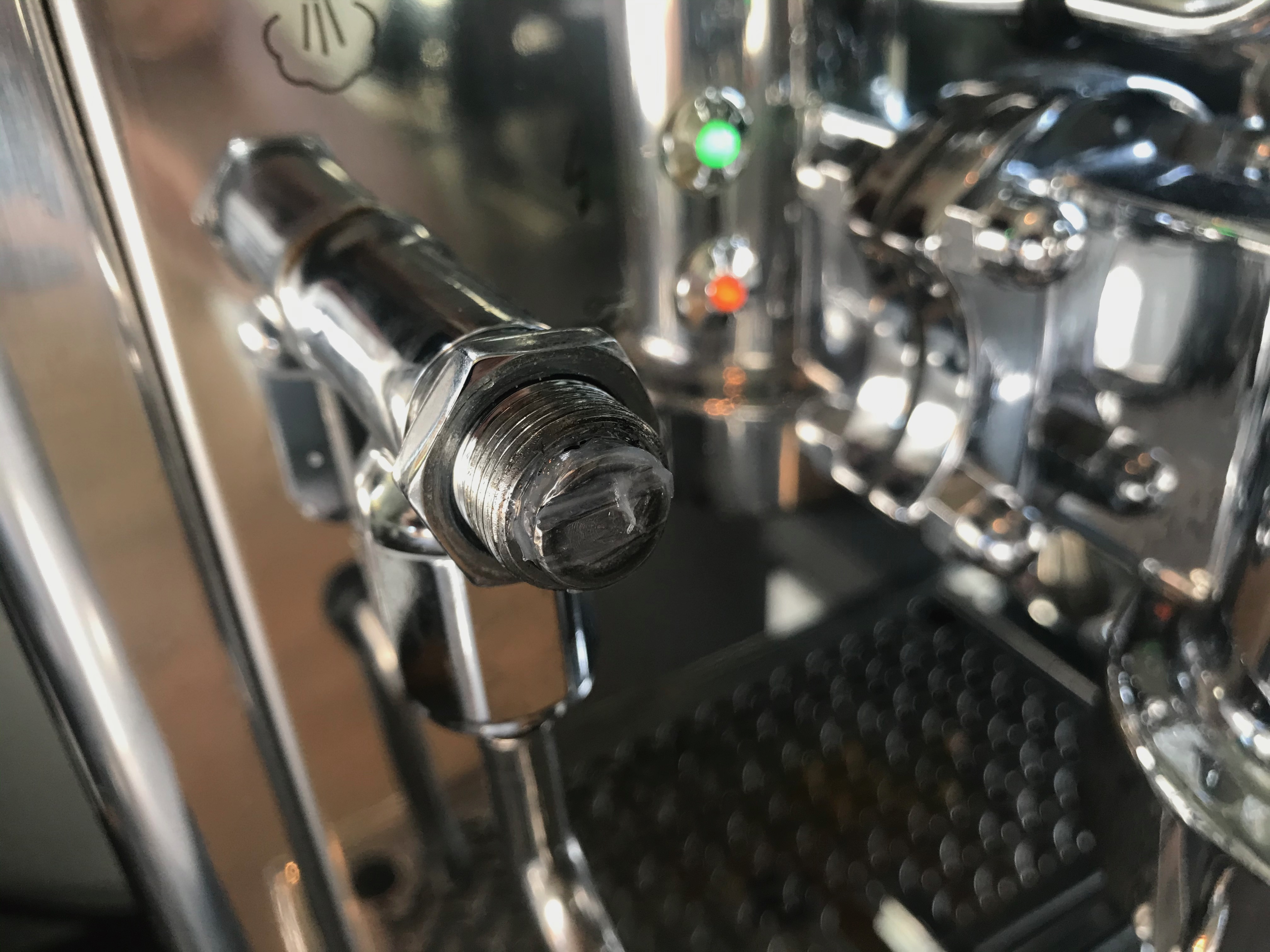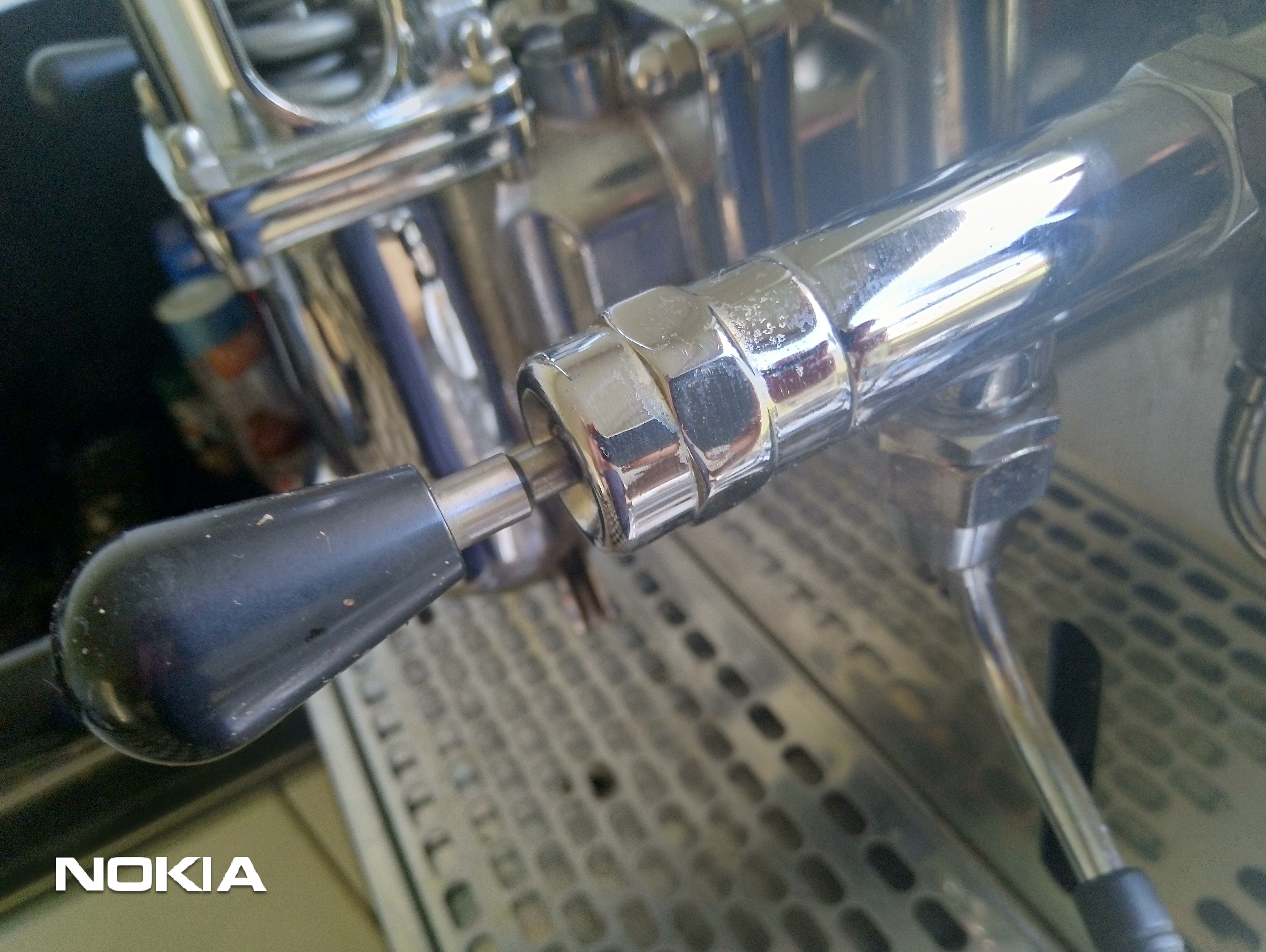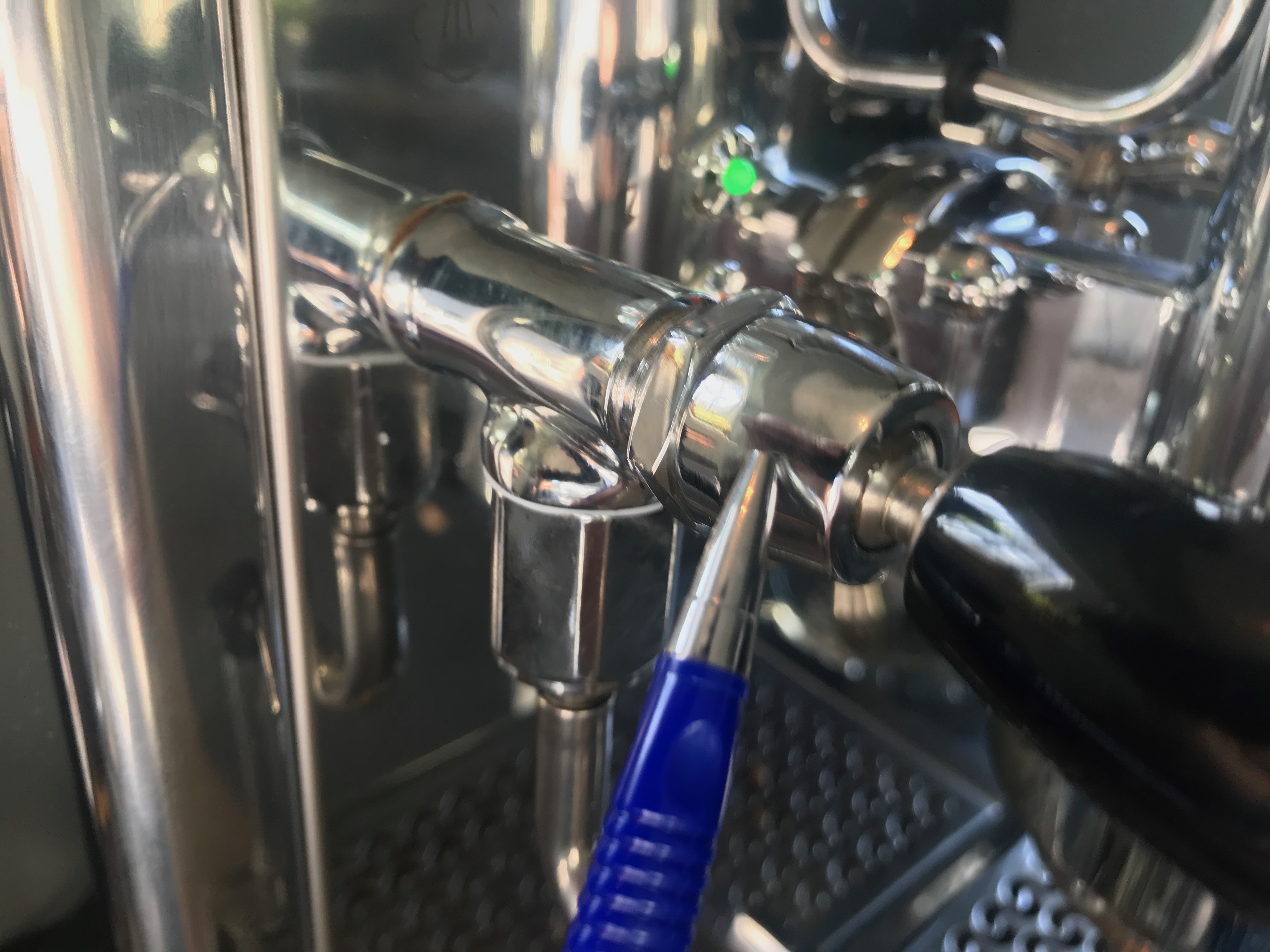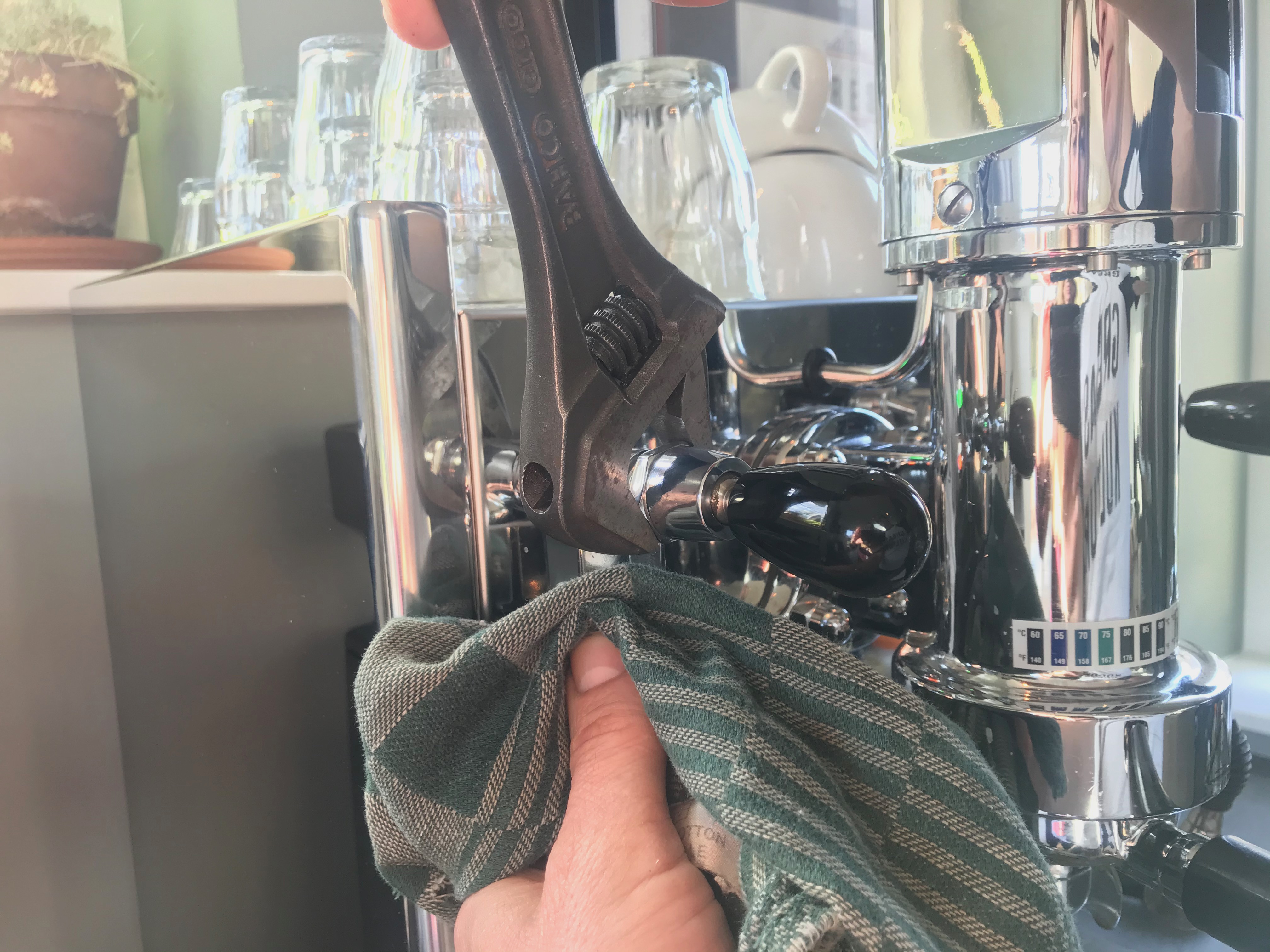 Je kunt ter bescherming van het chroom een doekje tussen de moer en de sleutel zetten. Als je met een goed passende sleutel voorzichtig draait is dat op zich niet nodig. De stoomkraan even met de hand tegenhouden. Een theedoek help dan tegen het verbranden van je vingers aan de hete kraan. Je moet hem met de klok mee losdraaien