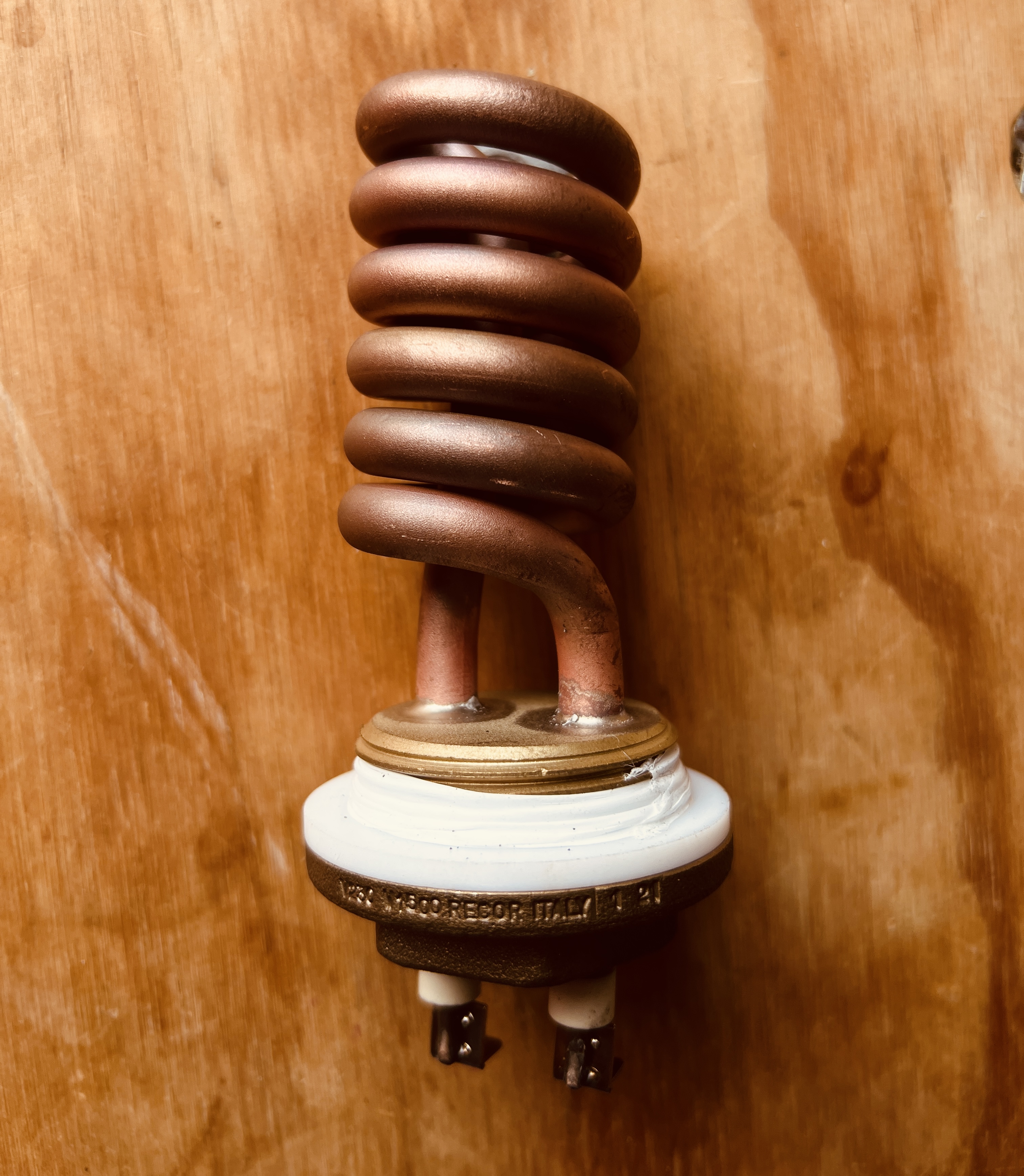 Het vervangende verwarmingselement van Peter/Kafko was door Peter 'plug and play' verzonden incl pakking en tape dus ik kon 'm er zo in draaien. Goeie tip van Peter om de machine daarna eerst helemaal warm te stoken (daarna uit te zetten) en dan het element nog eens iets aan te draaien.