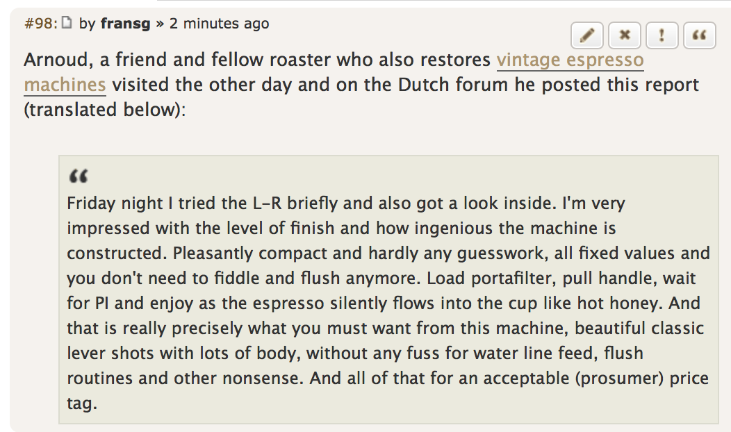 Lekker compakt en nauwelijks natte vinger werk, allemaal vaste waardes en je hoeft niet meer te spelen en te flushen. Filterdrager laden, hendel overtrekken, wachten op PI en genieten terwijl de espresso in stilte als warme honing in het kopje vloeit. En dat is ook eigenlijk precies wat je van deze machine moet willen, mooie klassieke hevelshots met veel body, zonder gedoe van vaste water aansluitingen, flushroutines en andere ongein.