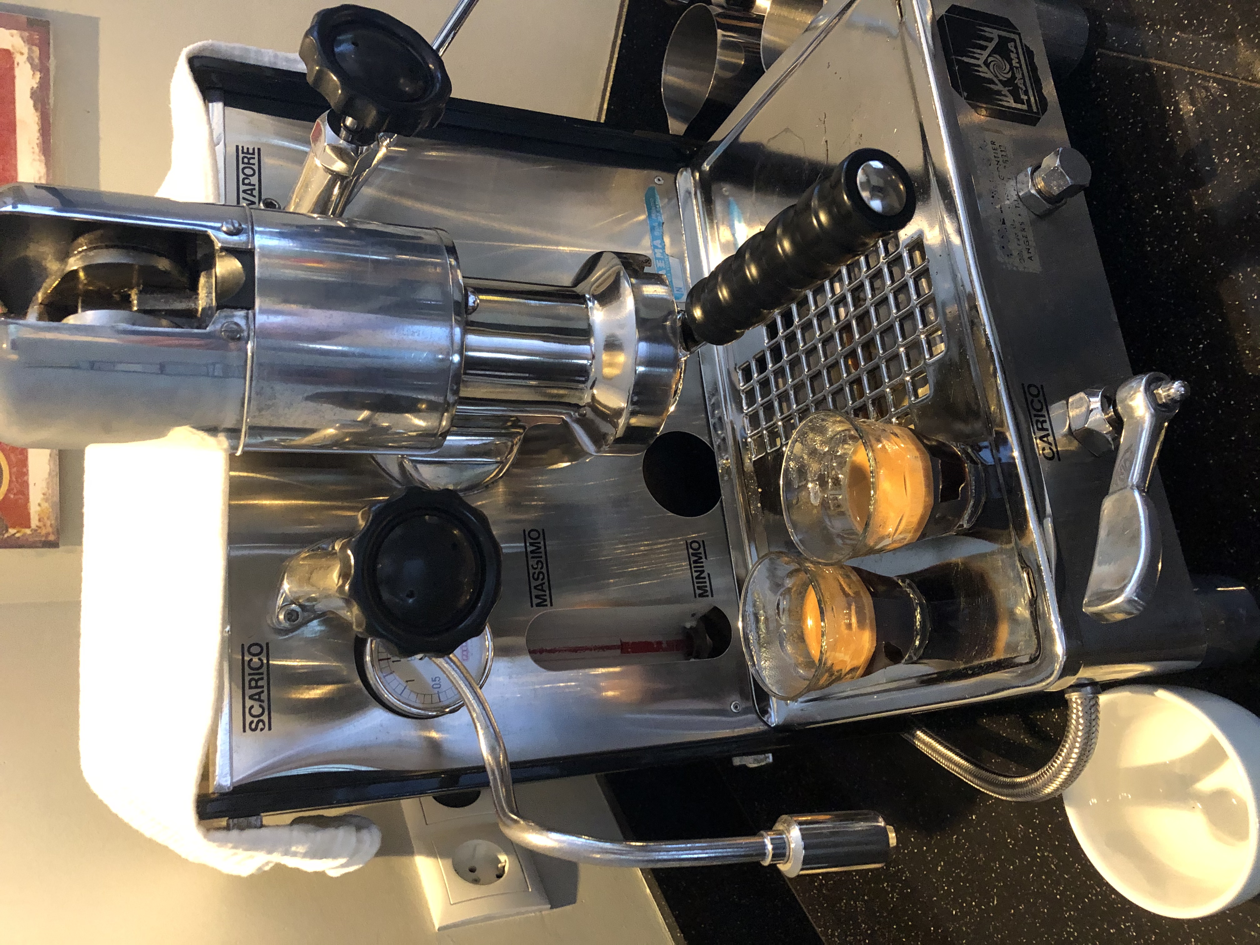 Met de La Pavoni Europiccola, 12 gram gemalen koffie, dubbele portie bakje, ca. 25 sec doorlooptijd, 24 gram koffie. Hoe zeggen we dat hier: "Valt niet tegen."